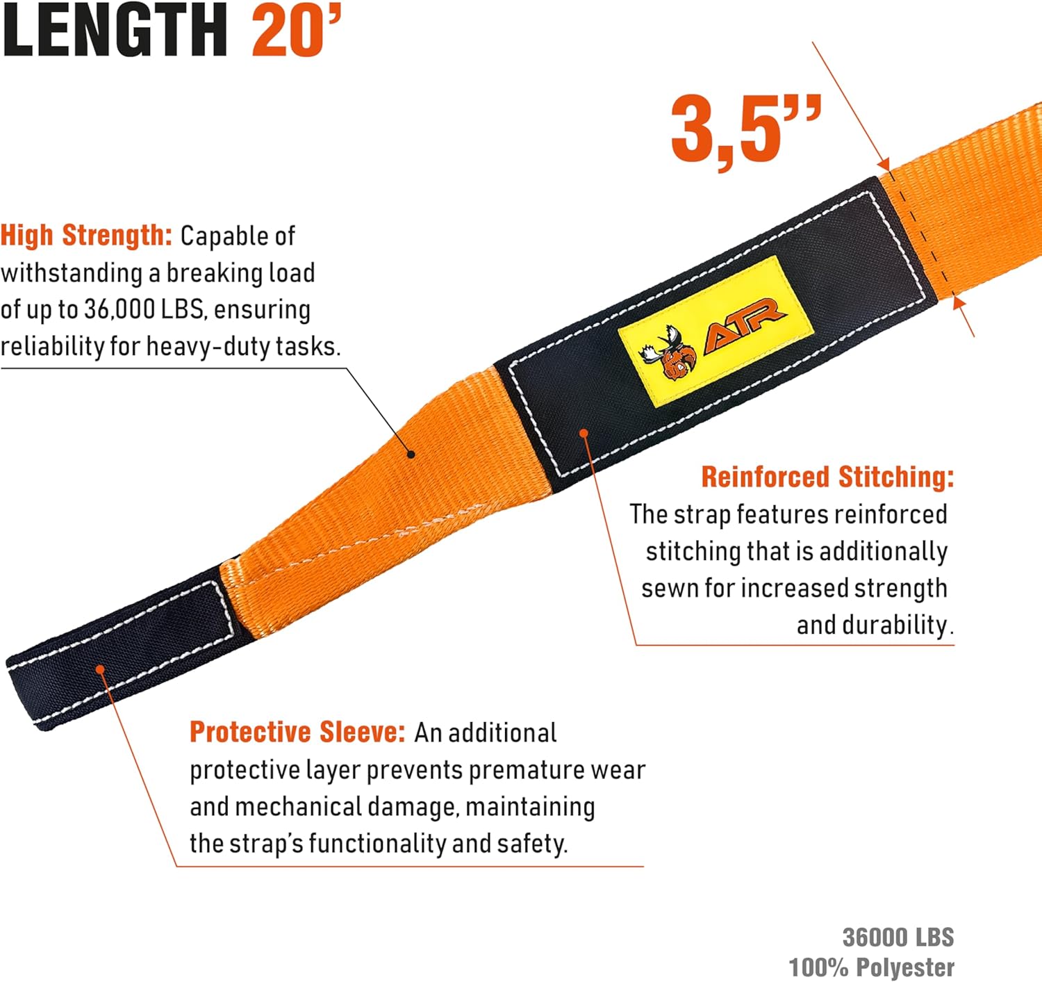 ATR Recovery Tow Strap 3.5" x 20ft – 36,000 lbs Break Strength, Heavy Duty Snatch Strap for Truck, SUV, UTV, Off-Road Pulling, Tow Rope with Storage Bag