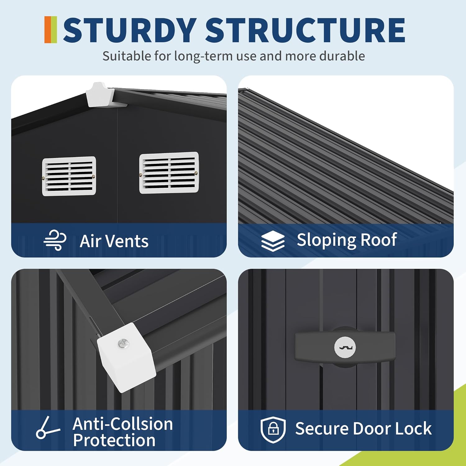 - Sloped Roof & Lockable Door & Air Vents: The sloped roof is engineered to enable rapid drainage of rainwater. The lockable doors serve to bolster security, warding off both strangers and small animals from unintended entry. The incorporation of air vents is a strategic design choice that significantly boosts air circulation. This, in turn, safeguards your stored items against mold growth and damage during sweltering and humid summers. Additionally, plastic protective caps are furnished for the s