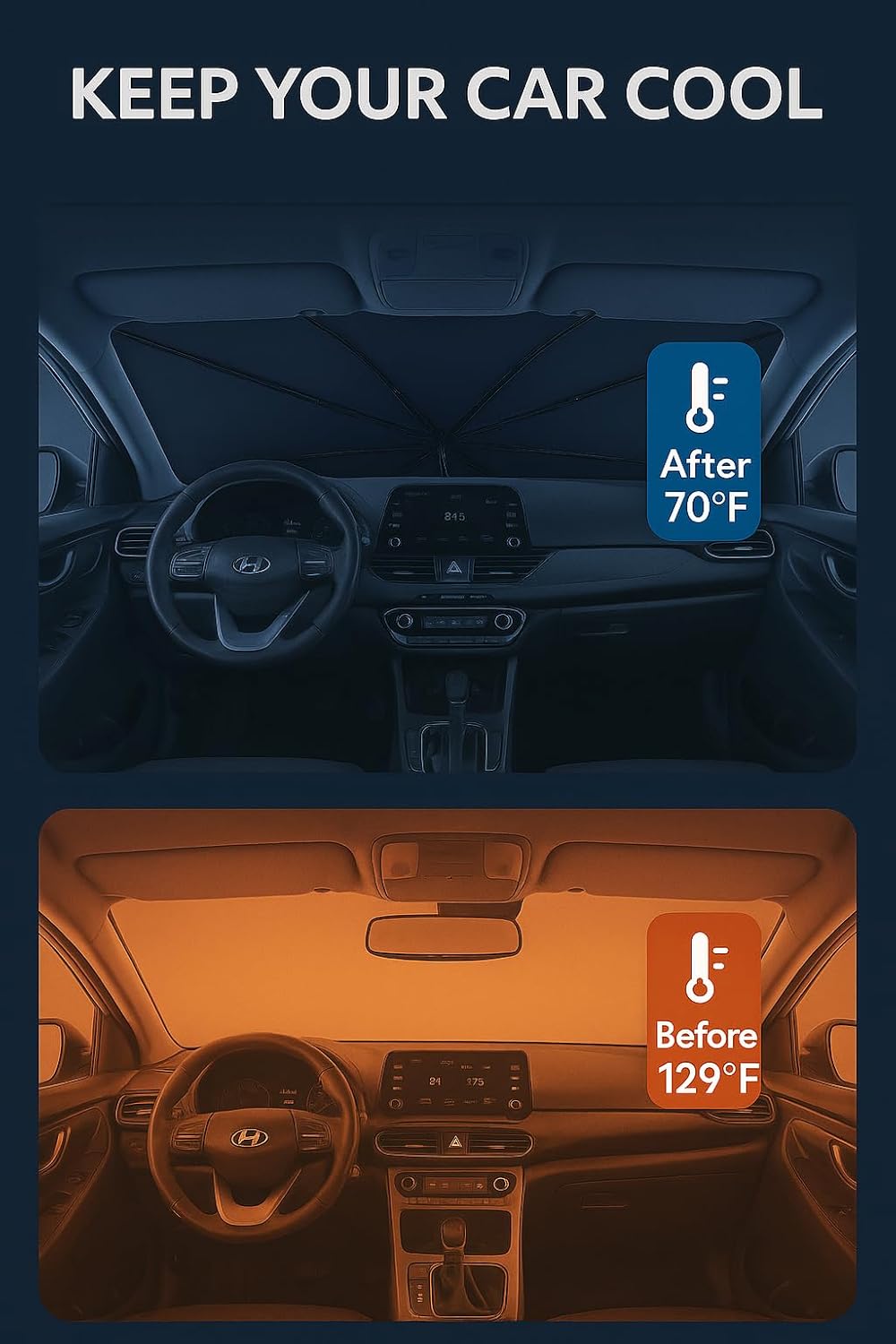 - Innovative Ice Crystal Material: The sunshade adopts a 4-layer design, which is thick enough to effectively block and reflect sunlight. After multiple uses, it is still strong and not easy to tear. The sunshade also uses innovative ice crystal materials to evenly distribute heat, quickly cool down, and keep your car cool all the time. You no longer have to worry about getting your seat or car handle scalded by high temperatures.