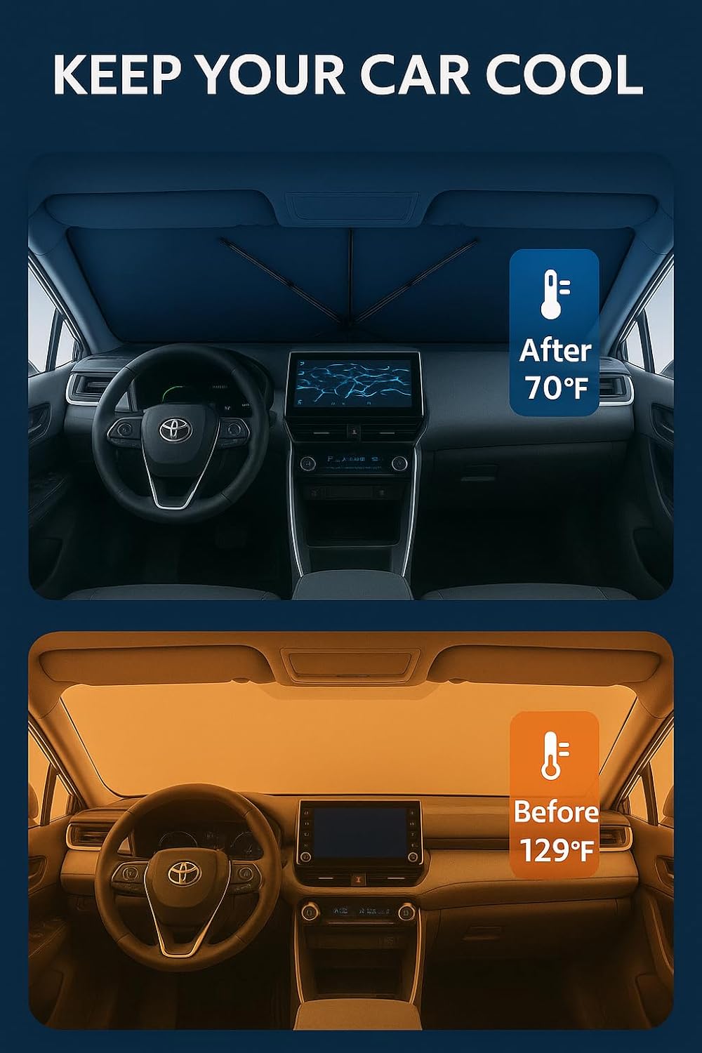 - Innovative Ice Crystal Material: The sunshade adopts a 4-layer design, which is thick enough to effectively block and reflect sunlight. After multiple uses, it is still strong and not easy to tear. The sunshade also uses innovative ice crystal materials to evenly distribute heat, quickly cool down, and keep your car cool all the time. You no longer have to worry about getting your seat or car handle scalded by high temperatures.