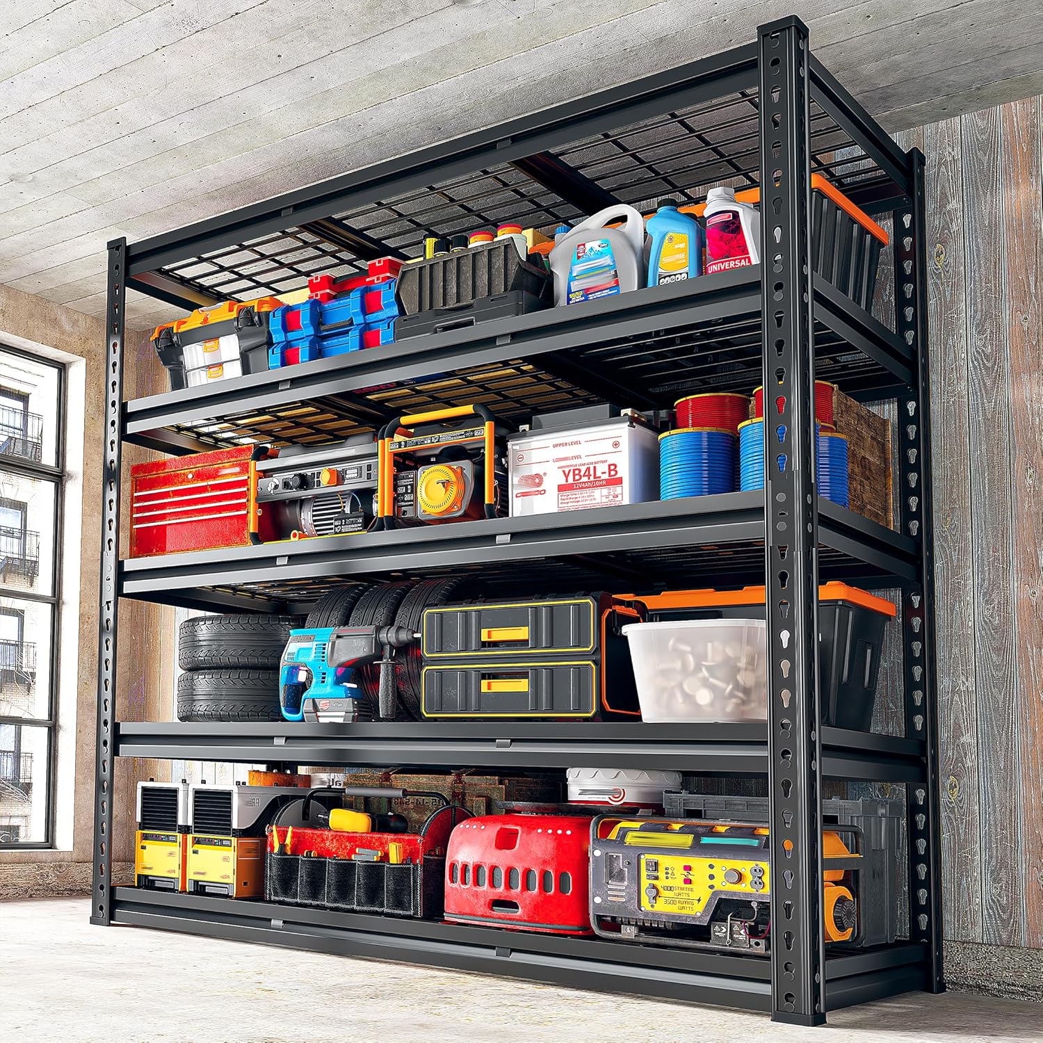 - ă2750LBS Super Sturdy Garage ShelvesăThis garage shelving heavy duty can handle up to 2,750 pounds. Each shelf has two support bars at the bottom, boosting the load capacity of each level to 550 pounds. The metal shelves uprights feature a rolled-edge design to prevent bending under heavy loads, ensuring a more stable and reliable storage solution