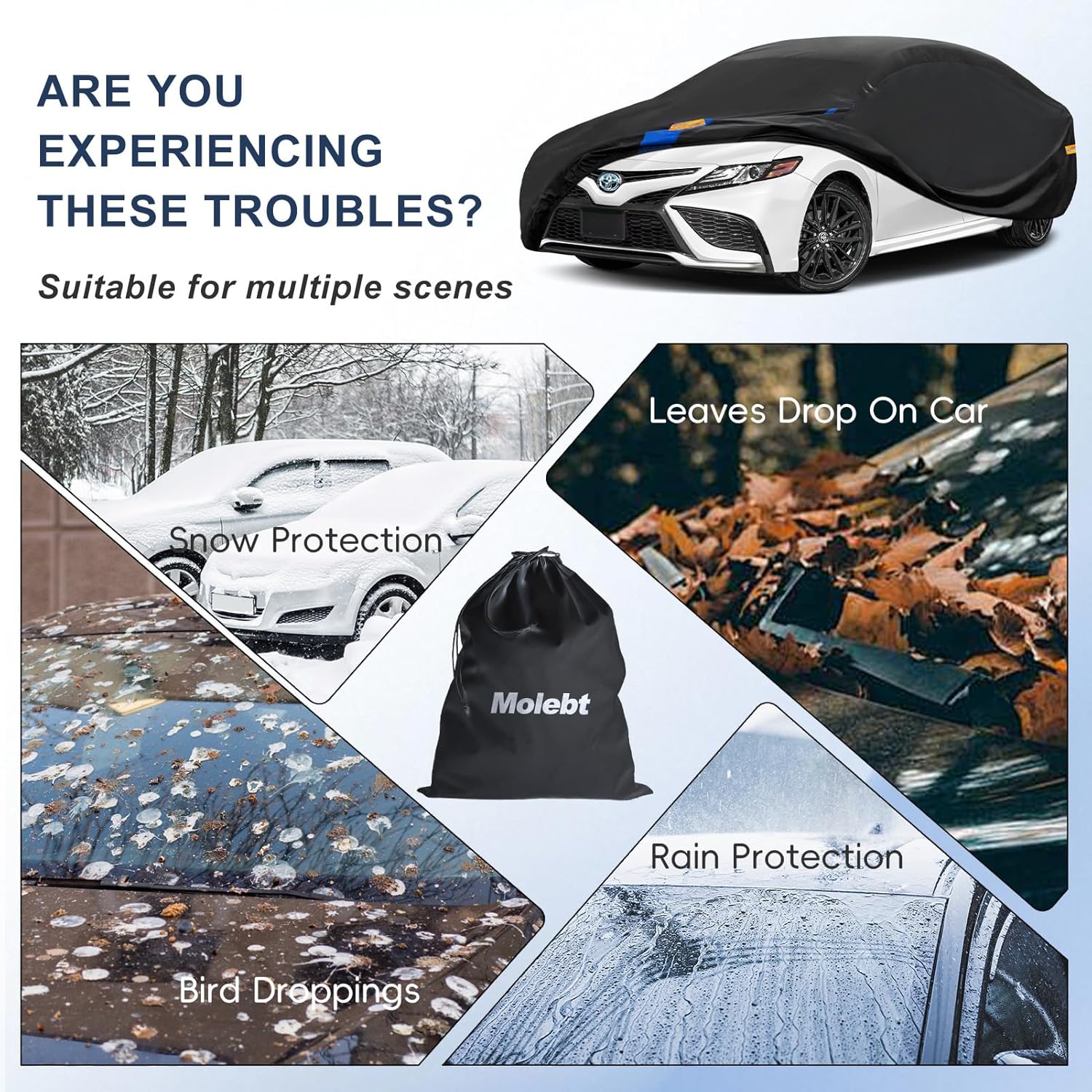 - ăAll-Season Protection: Total Weather DefenseăMolebt Sports Outdoor Car Cover is designed to provide year-round protection for your vehicle. Whether it's spring pollen, summer heat, autumn leaves, or winter snow, it reliably shields against dust, pollutants, bird droppings, acid rain, UV rays and heavy rainstorms.