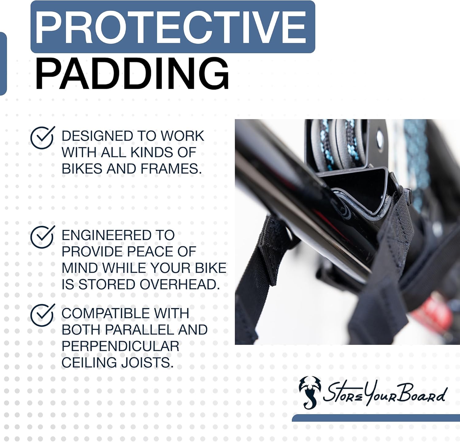 - No-Slip Storage: Overhead bike storage that wonât slip, tilt, or drop. Unlike others that leave the bike loose or wobbly, this hoist stabilizes the frame, front wheel, and handlebars with a hook-and-loop strap and an adjustable buckle strap.