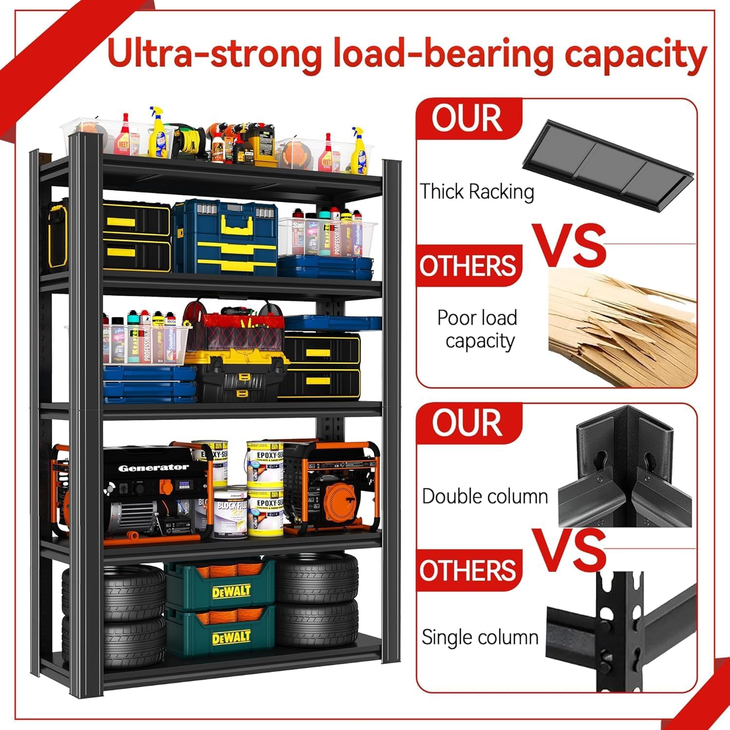 • 【Strong Load-bearing Capacity】Shelves are made of high-quality steel, our garage shelves have extraordinary load-bearing capacity, even heavy toolboxes, tires or sports equipment can be easily carried to ensure the safety of your belongings