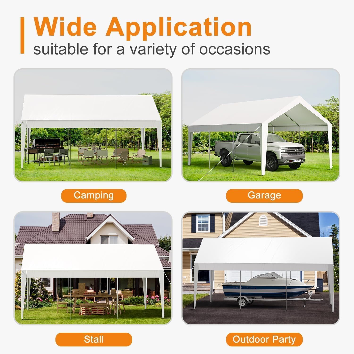 - [Spacious Shelter for Your Needs]The 10'x20' heavy-duty carport offers ample space for your vehicles like cars, trucks, boats, or cargo. It serves as an excellent venue for outdoor events such as parties, trade shows, and weddings, comfortably accommodating up to 30 guests. This versatile carport is a must-have for anyone seeking extra outdoor shelter, making it ideal for both personal and commercial use.
