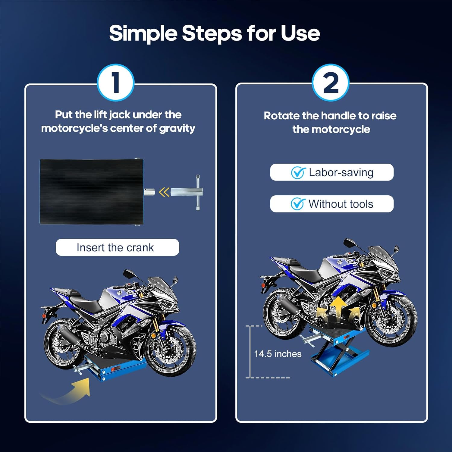 - The motorcycle lift jack comes with a 7/8 socket and a special crank handle, making the lifting process easy and convenient. Simply rotate the handle to lift your motorcycle quickly and effortlessly.