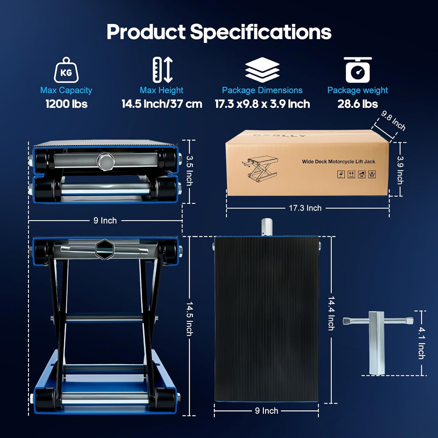 - This motorcycle lift jack boasts solid steel construction with a lifting capacity of 1200lb, making it sturdy and reliable for lifting heavier bikes.