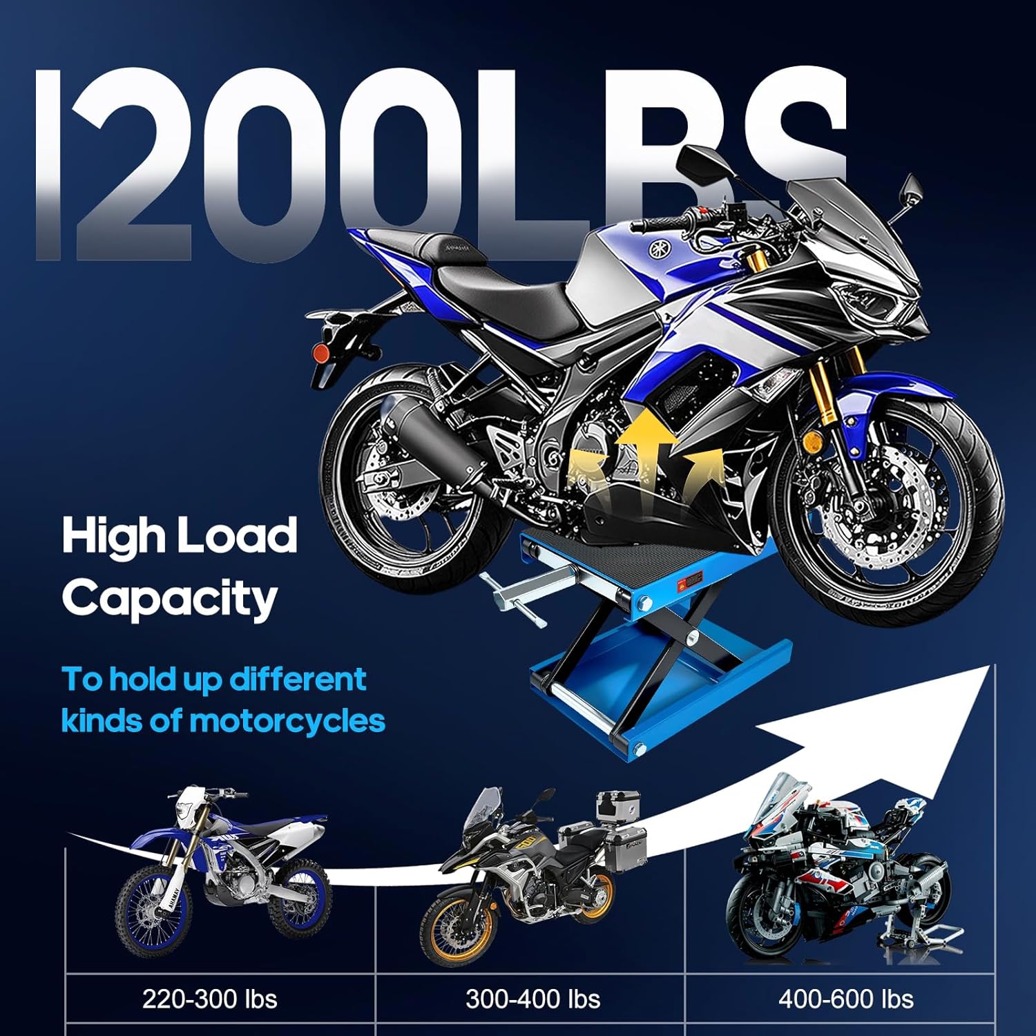 Motorcycle Lift Scissor Jack, 1200 LB Capacity Wide Deck Hoist Stand Maintenance Bikes ATVs Garage Repair Center Stand Lift Jack, Blue
