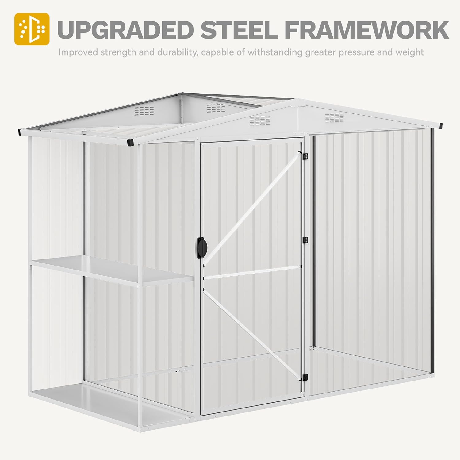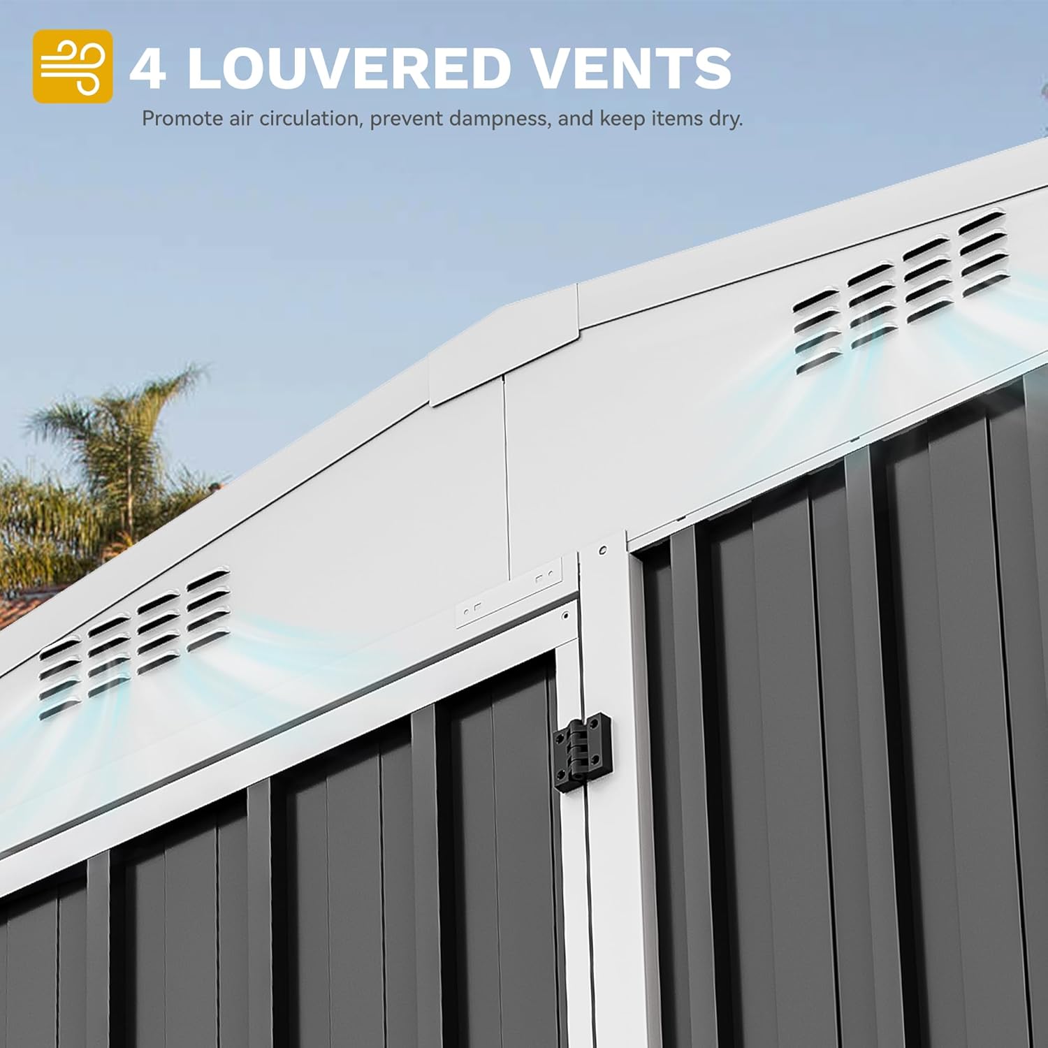 - Smart Roof & Airflow Design: With a slanted roof to shed rain and snow effortlessly, this metal storage shed keeps contents dry, while dual top vents ensure a fresh, breezy interior, suitable for storing supplies or nurturing plants