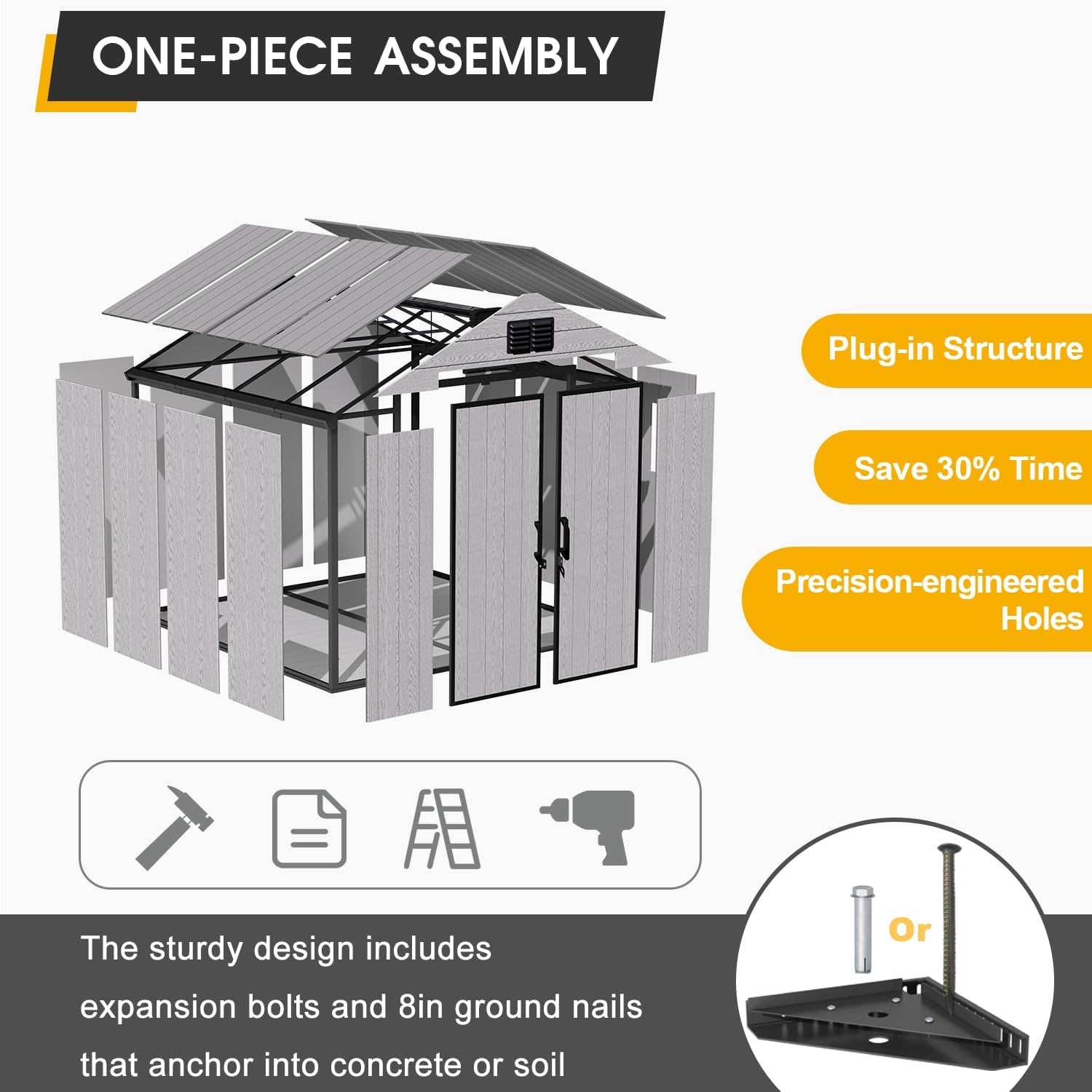 - Quick and Hassle-Free Assembly: The one-piece plug-in design simplifies installation, saving 30% time compared to other stoagre shed. If you have any questions during assembly, our responsive 24/7 customer support team is always available to assist. Please rest assured that since the manual contains the installation process of all sizes currently on sale, you only need to read part of it