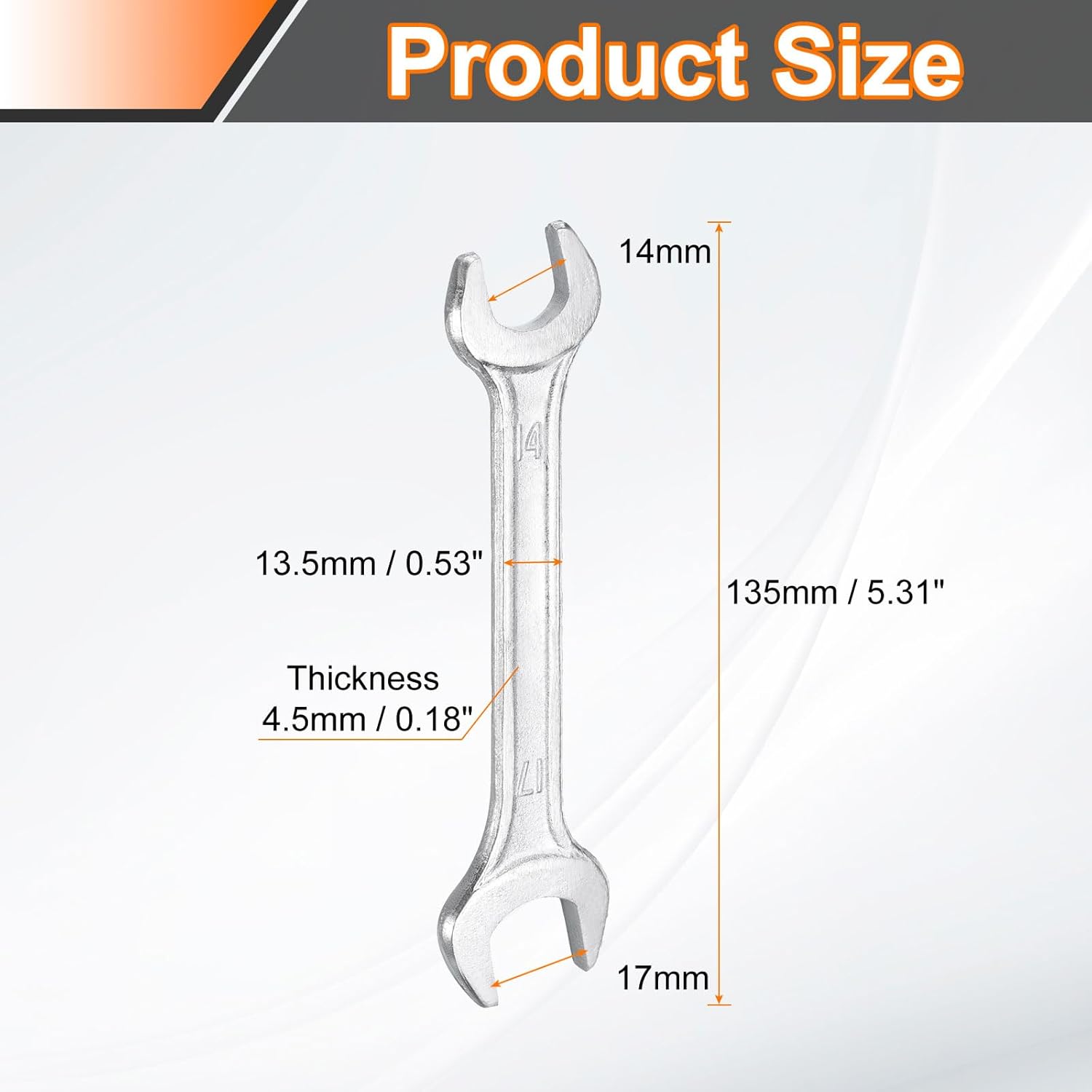 - Size - Metric Open End Size: 14mm x 17mm; Total Length: 135mm / 5.31"; Handle Width: 13.5mm / 0.53". Handle Thick: 4.5mm / 0.18". Size stamped on both ends of the handle for quick identification