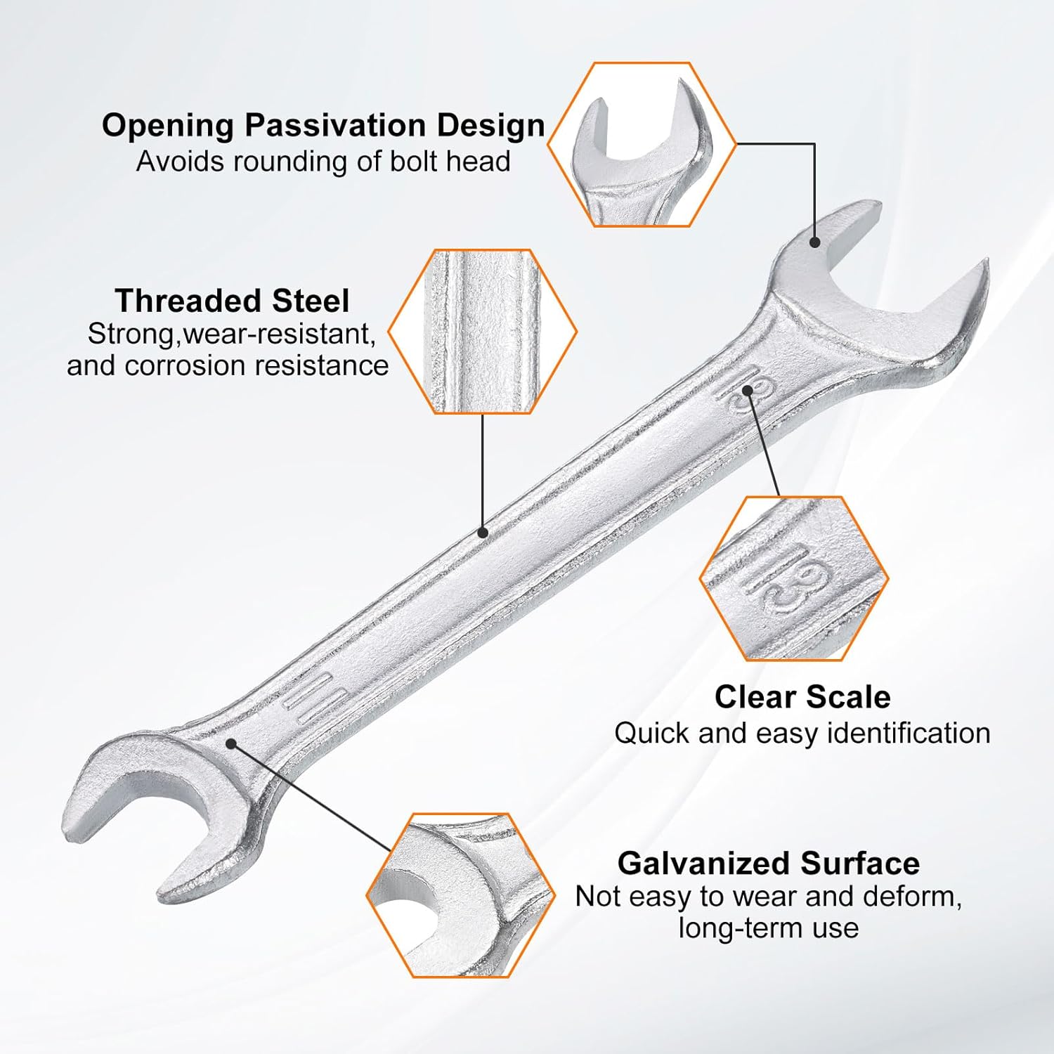 - Material - Our double open-end wrench is made of threaded steel with high hardness and excellent wear resistance. The surface galvanizing improves its wear resistance, keeps its surface smooth and reduces wear, is not easy to deform, and can be used for a long time.