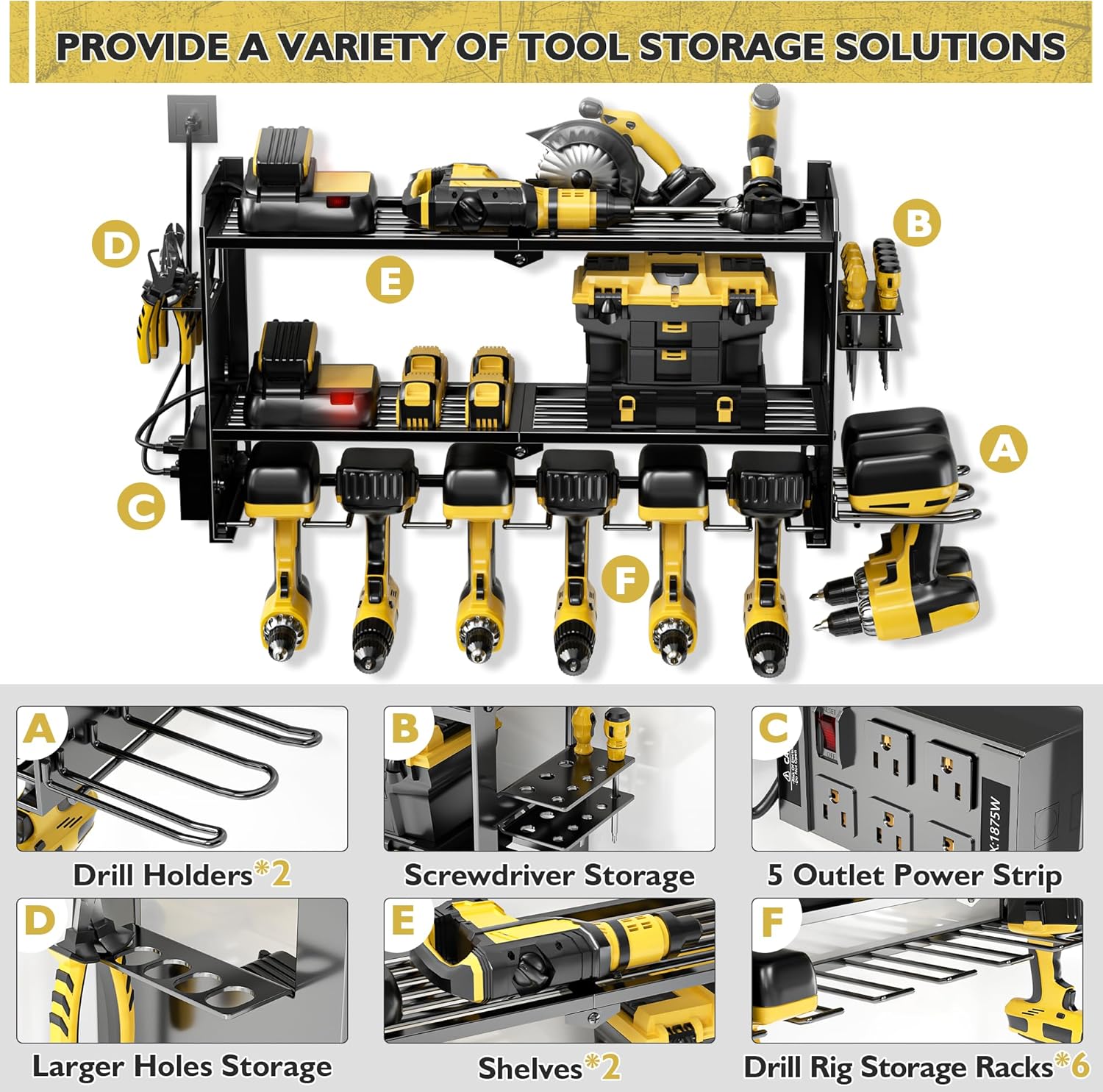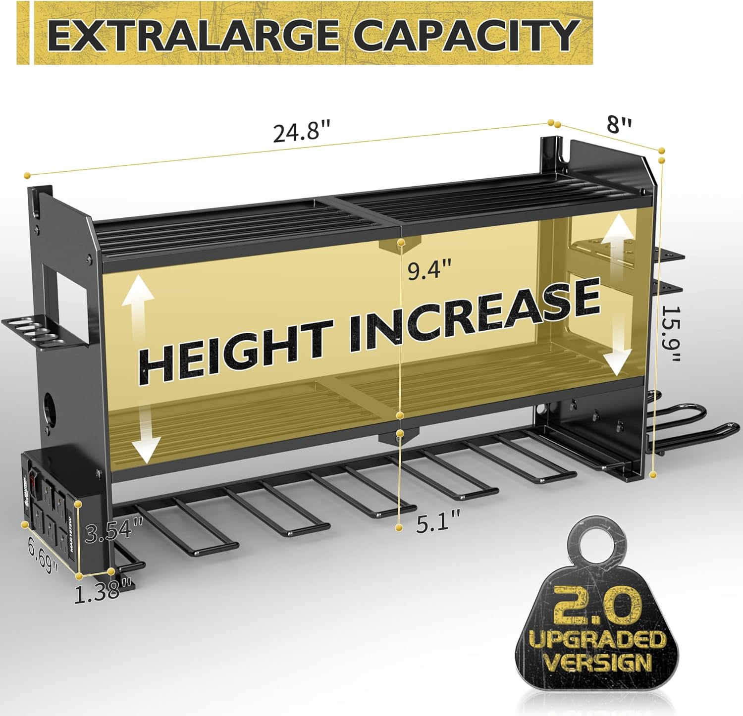 - 【9.4-inch mid-tier and more Storage】This power tool organizer features the lastest high capacity design,The 9.4-inch mid-tier tool rack can hold more larger power tools and charging stations and large toolboxes,batteries,making it your all-in-one solution