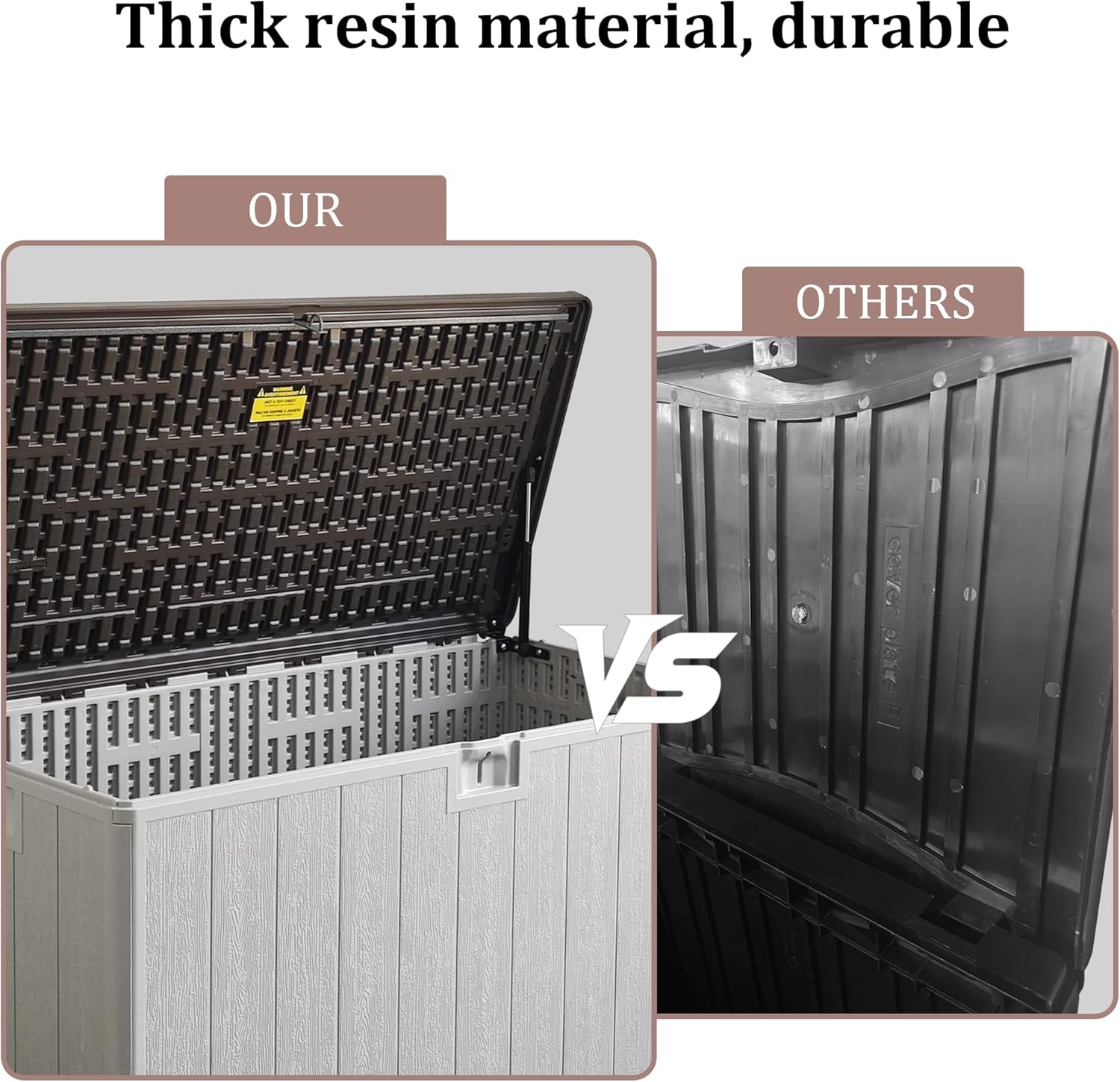 - Weatherproof Resin for Year-Round Use. Durable, waterproof resin, this deck box resists rain, sun, and UV exposure. Ideal for all-season use, it wonât peel, rust, or warp like wooden or metal boxesâkeeping your items protected outdoors.