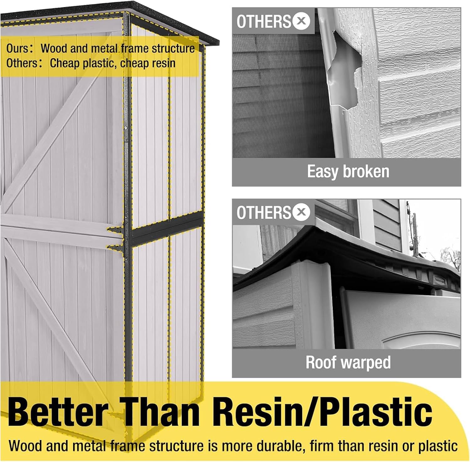 - Compact Size with Floor Base – Sized at 4.6 x 2.42 FT, this shed fits easily in small spaces like patios, decks, or narrow sides of the house. Built-in floor keeps items off the ground, protecting them from moisture
