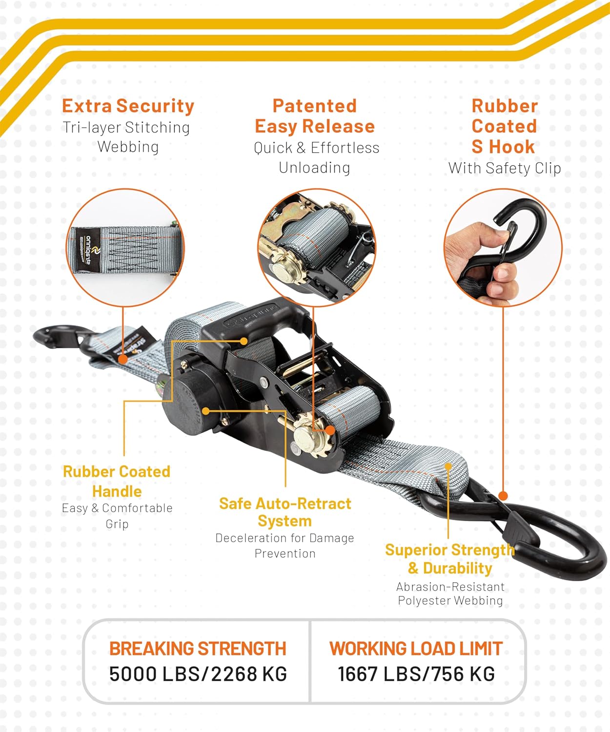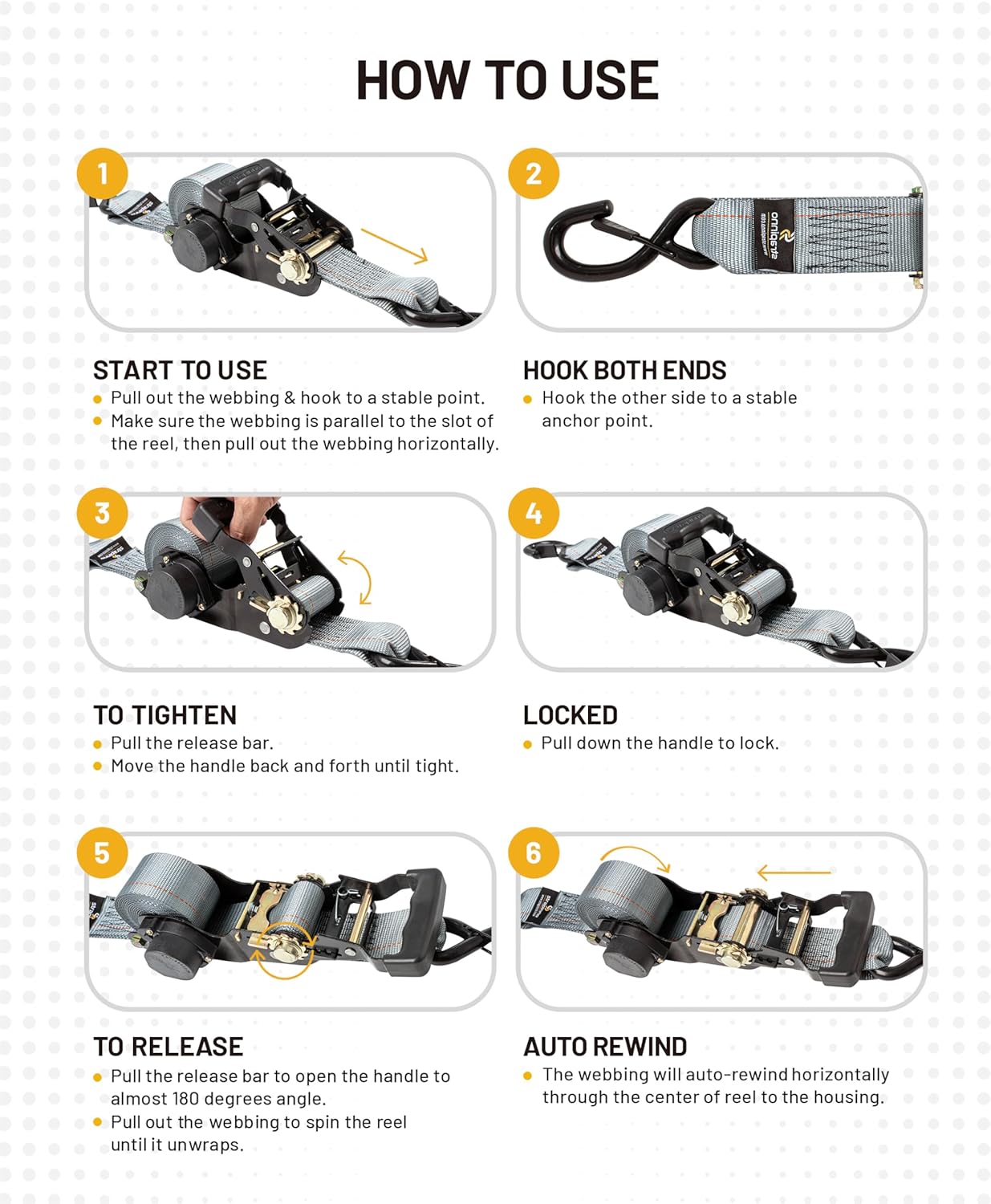 - Smooth Hauling. With our retractable ratchet straps, you'll feel like a pro with their easy-to-use design - simply open the handle, extend the strap to your desired length, latch it onto the S-hook, and ratchet tight for secure load fastening and unbeatable time-saving convenience.