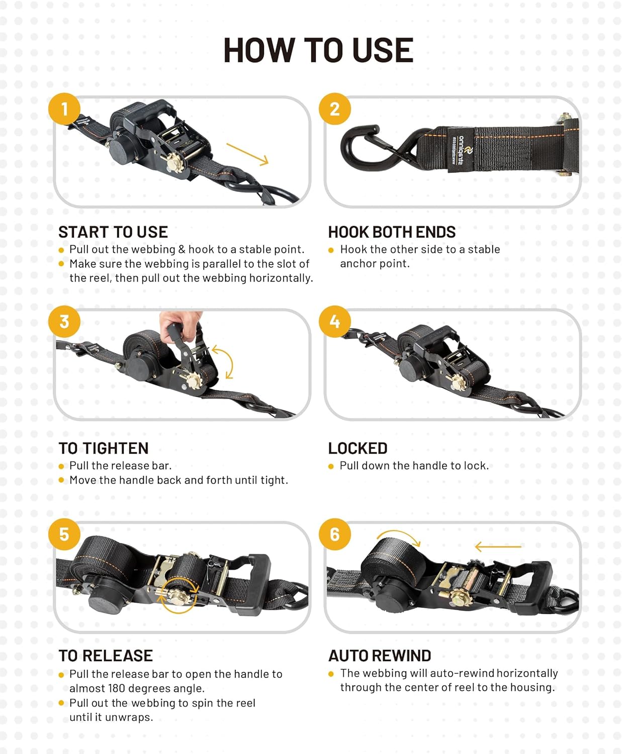 - No Tangle, No Stress. Our ratchet straps are designed to make your life easier. With an automatic retracting mechanism, you no longer need to worry about untangling or winding up straps by hand. When you're done, release the latch and let the strap retract on its own. Plus, with the storage bag, you can keep your straps organized and ready to go at a moment's notice.