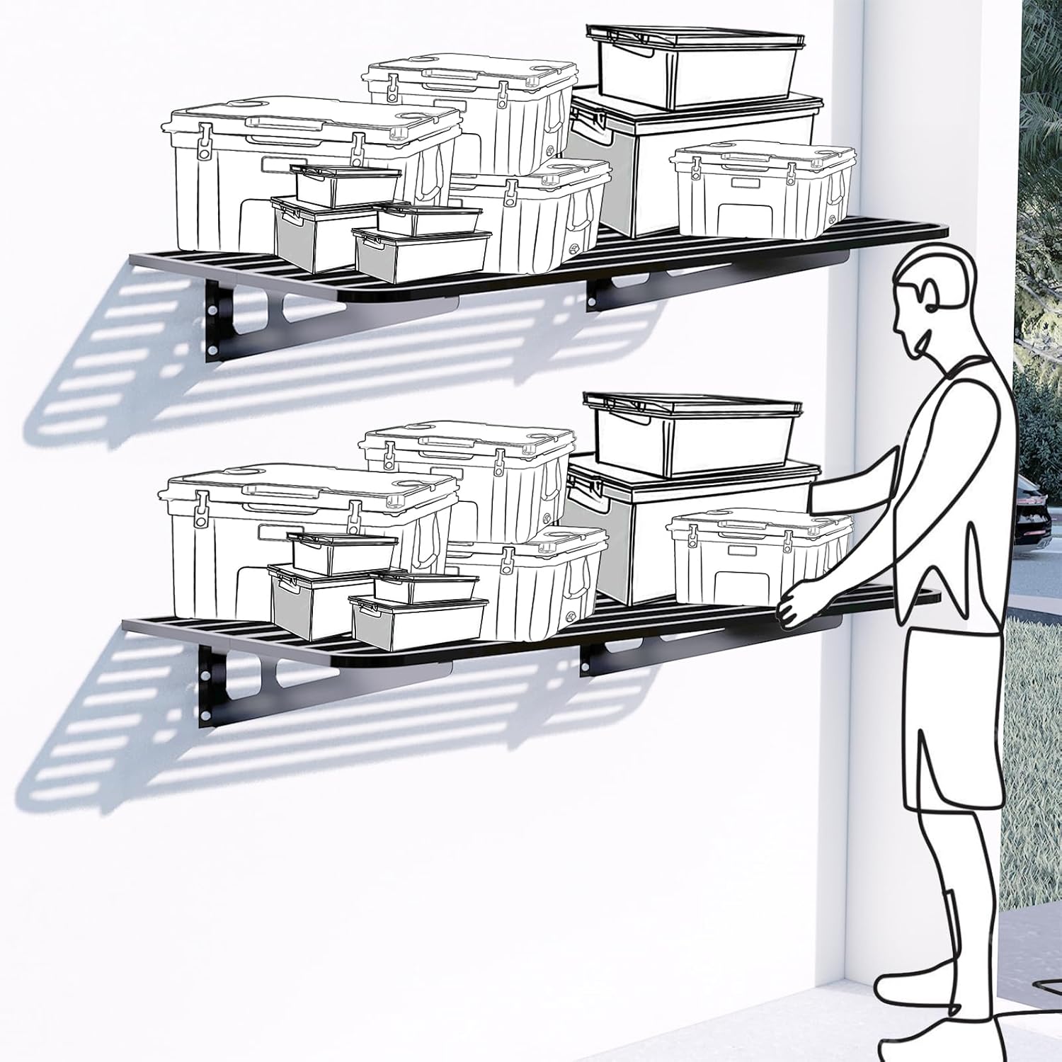 - ăGarage Shelvingă: Includes a 2-pack of wall mounted garage shelves, each measuring 24 x 48'IN, perfect for holding storage bins, boxes, sporting goods, tools, and more. say goodbye to cluttered garage space storage.