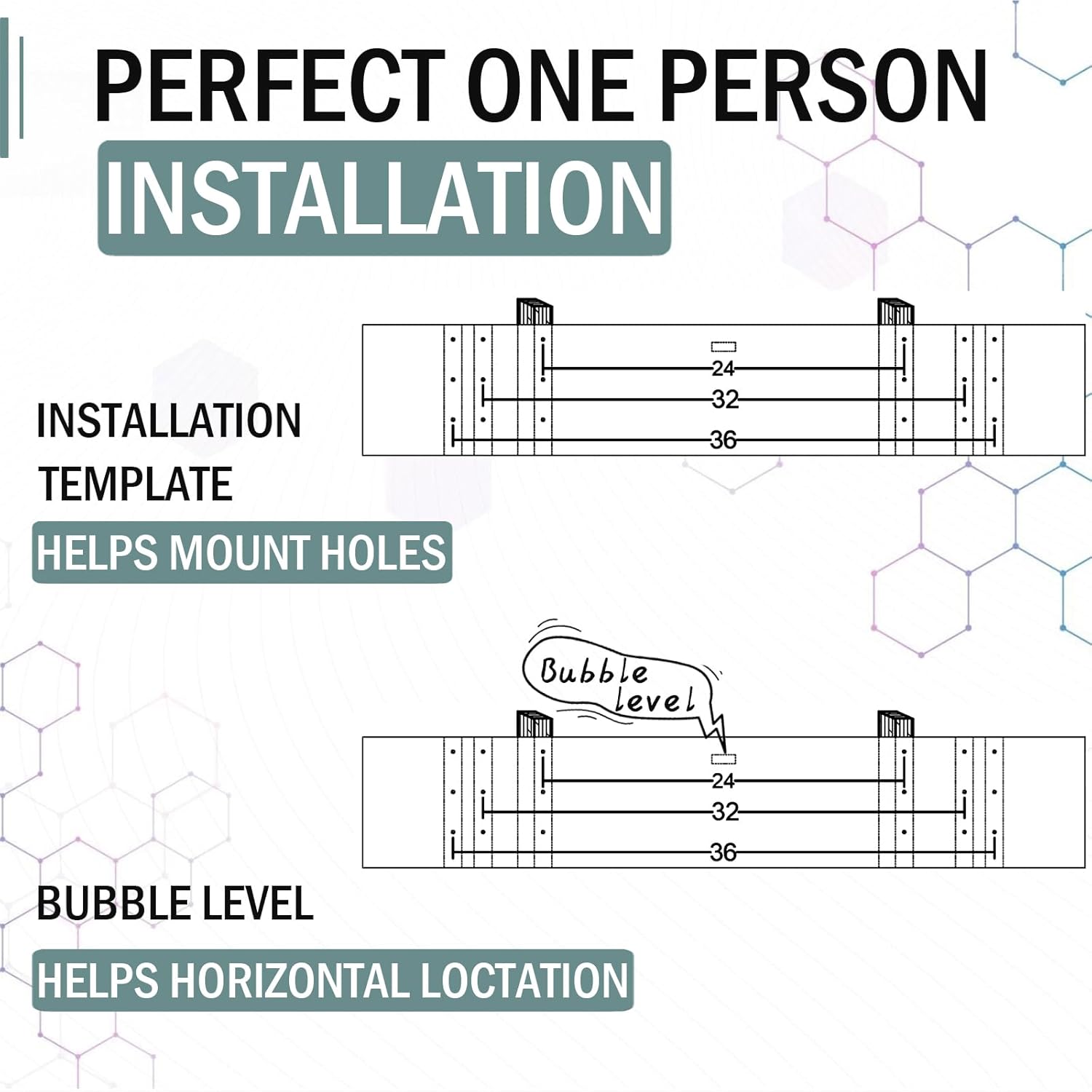 - ăQuick â Secure Setupă: Easy one-person installation with all hardware included: Installation Template helps mount holes; Bubble Level helps get perfect horizontal location.