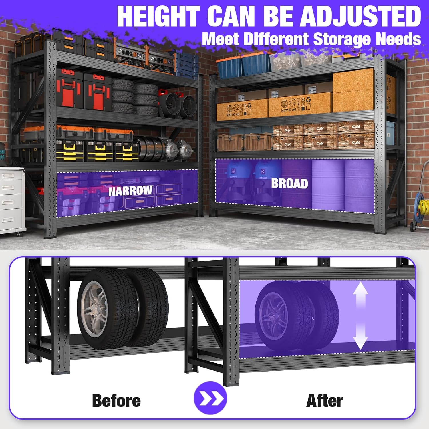 - ăAdjustable Storage SpacingăYou can adjust our storage shelves by moving the crossbar to suit the different heights you need. Our garage shelving can be used in many ways. They can help you tidy up your garage and make it more organised.