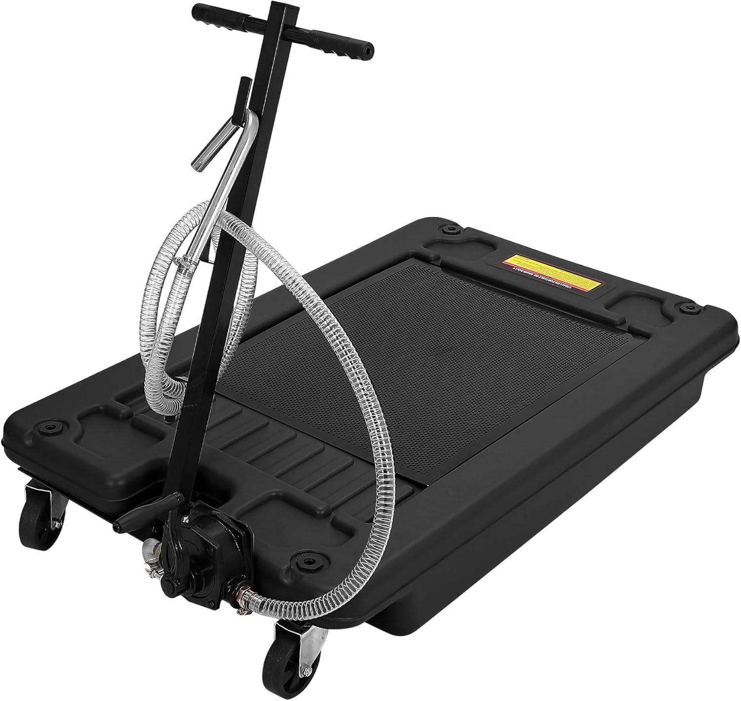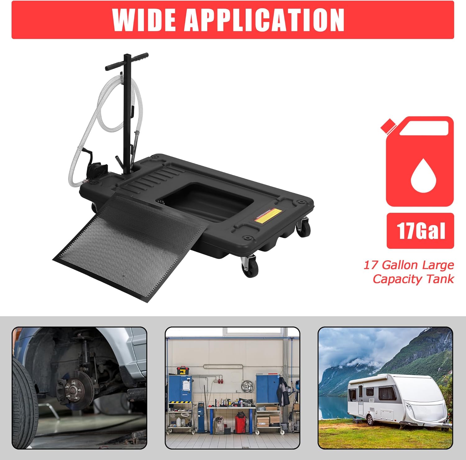 17 Gal Low Profile Oil Drain Pan, Heavy Duty Mobile Oil Changing Pan with Hand Pump, 8 Ft Hose & Quick Drain Valve, Leak-Proof Design for Truck Car Motorcycle, Garage Workshop Use