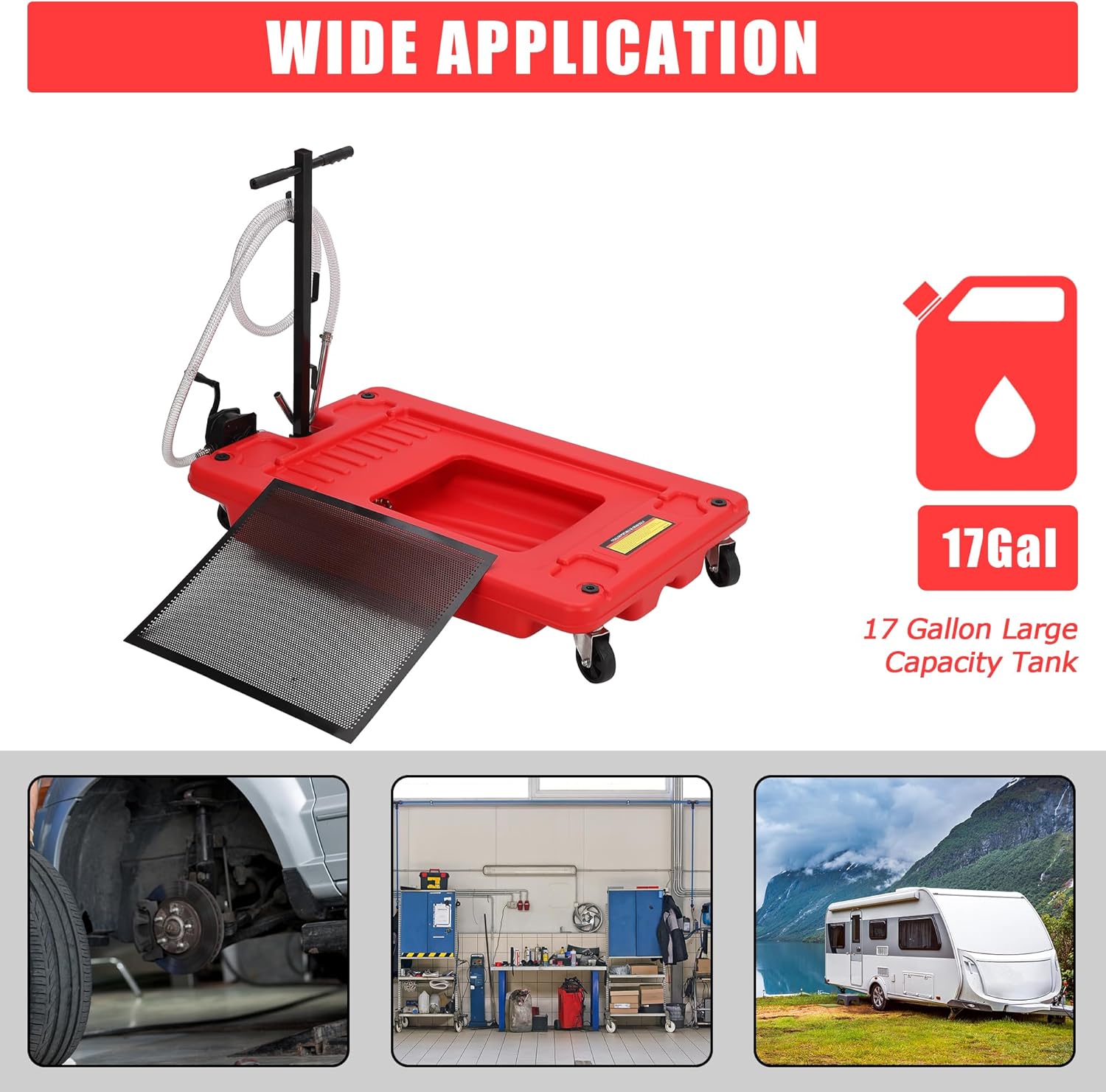 17 Gal Low Profile Oil Drain Pan, Heavy Duty Mobile Oil Changing Pan with Hand Pump, 8 Ft Hose & Quick Drain Valve, Leak-Proof Design for Truck Car Motorcycle, Garage Workshop Use