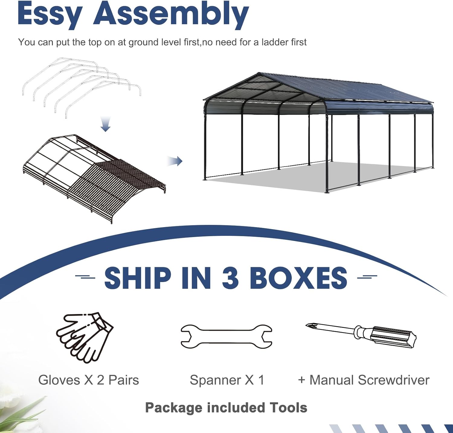 - EASY TO ASSEMBLE- We put protective tape to prevent you from getting scratched by sharp panels. We prefer to install it with 2 people.The garage comes with all the necessary hardware and easy-to-follow instructions, so you can be up and running in no time.Note that our products will be divided into 3 boxes, which might not arrive at the same time.