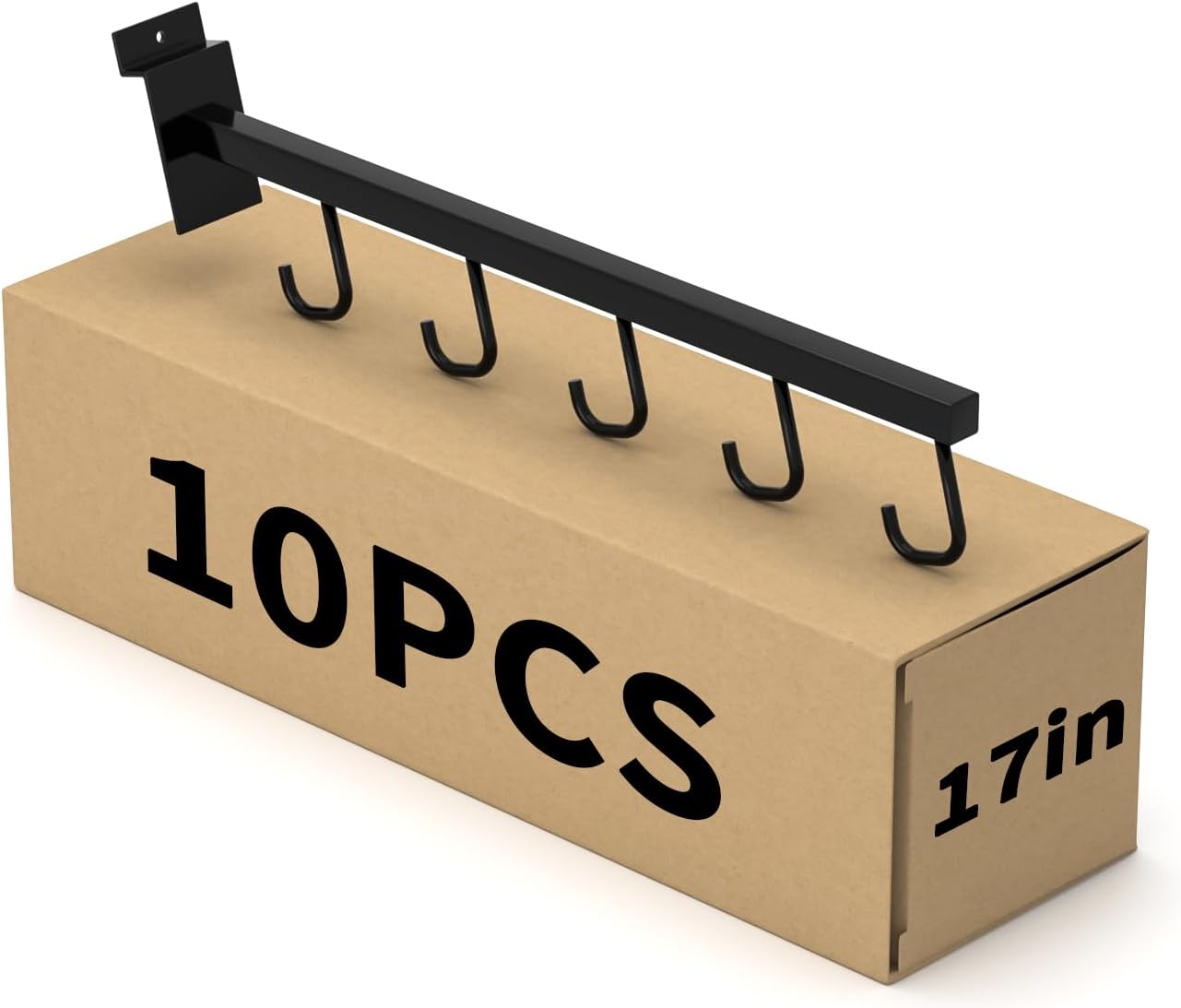 10-Pack 17-Inch Slatwall Waterfall Display Hooks with 5 J-Hooks – Black Slanted Arm Rack for Hanging Apparel, Bags & Accessories