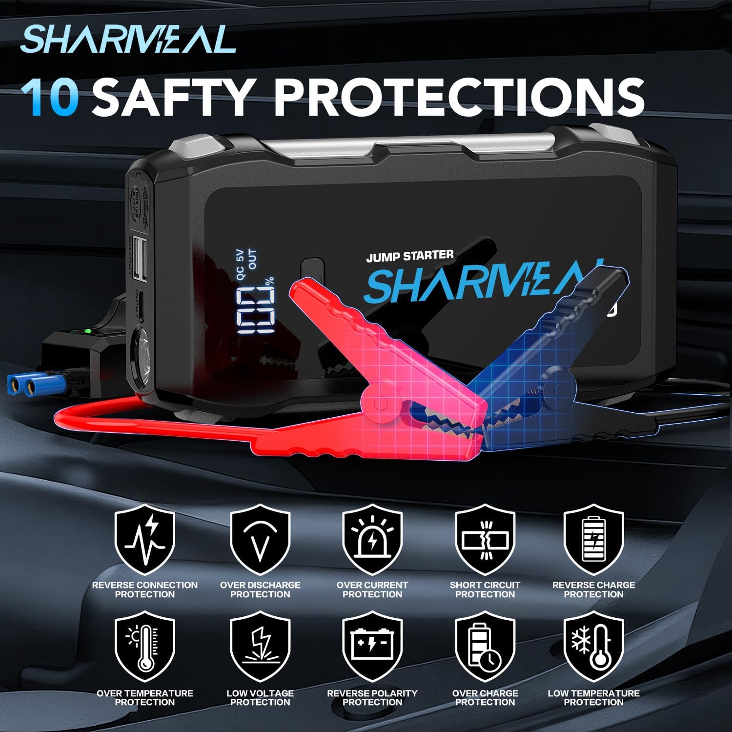 - ăUpgraded Jump StarterăThis car battery jump starter portable has 10 integrated protections including reverse polarity, reverse connection, overcurrent, overvoltage, overload, overcharge, over discharge, and short circuit protection. Ensure your trip is safe and smooth.