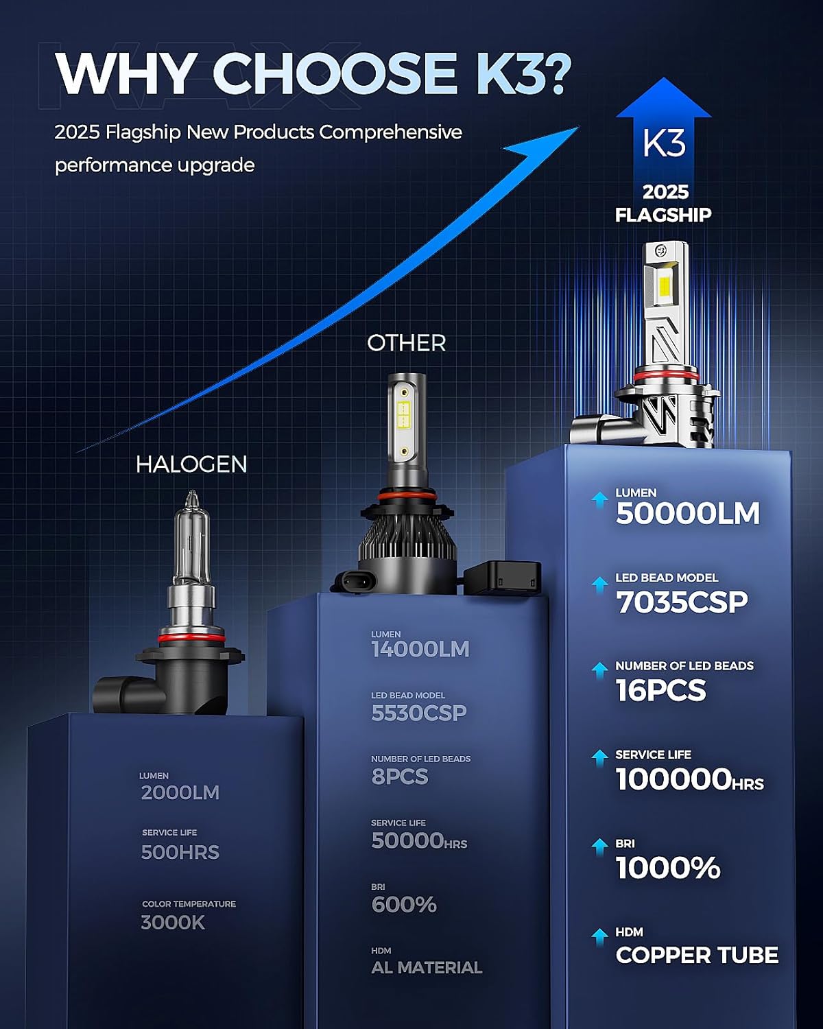 KAX 2025 10X Brightener 9005 Led Bulb for Car Owners, 50000Lm HB3 for Drivers at Night, LED Bulb During Bad Weather, 1:1 Real Size, 100000 Hours Lifespan, 99% Fit Your Vehicles, Plug & Play, 2 Pack