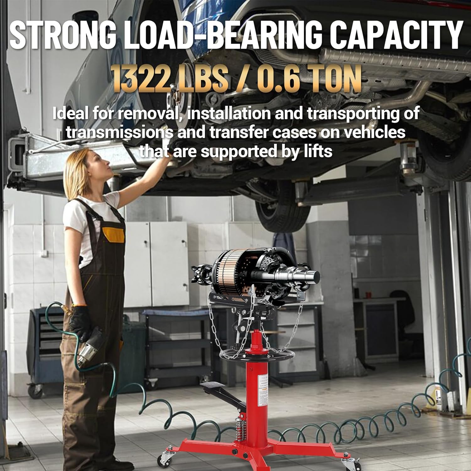 - ă1322 LBS Load Capacityă- This hydraulic transmission jack is engineered from robust carbon steel, ensuring exceptional durability and strength, and maximum load capacity is up to 1322lbs. Its wide base provides enhanced stability, while the two heavy-duty safety anchor chains securely hold the load in place, allowing for safe and efficient transmission service. In addition, it comes with an 8MM thick anti-slip pad to ensure safe load.