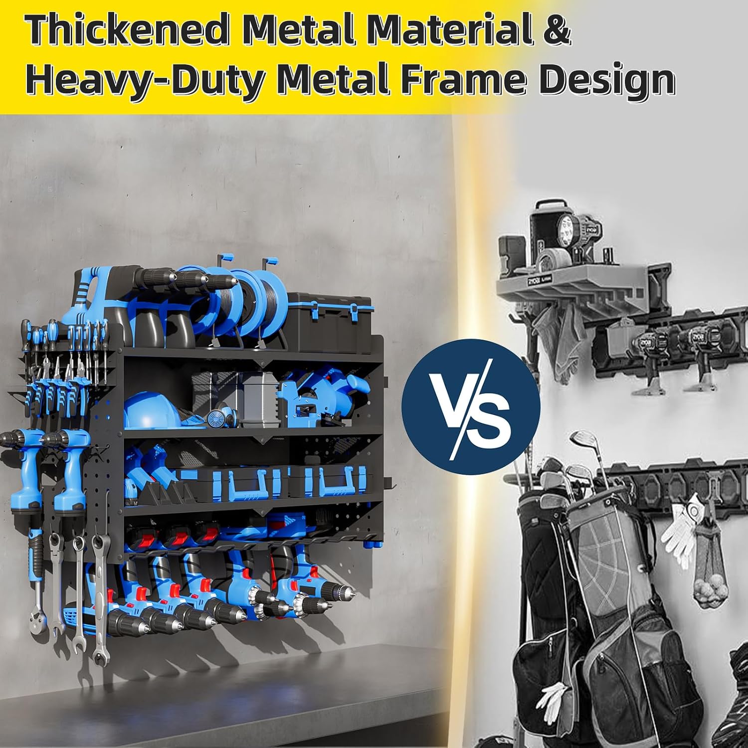 - 💪420-600 LB Load Capacity & Heavy-Duty Construction : Engineered from industrial-grade steel, our large power tool organizer wall mount boasts an exceptional 420-600 lb load capacity. Confidently store heavy power tool storage of any weight. Rigorous testing ensures stability – no more worries about breakage or falls.