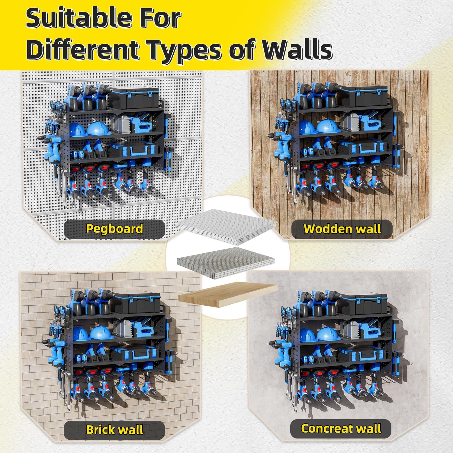 - 💪420-600 LB Load Capacity & Heavy-Duty Construction : Engineered from industrial-grade steel, our large power tool organizer wall mount boasts an exceptional 420-600 lb load capacity. Confidently store heavy power tool storage of any weight. Rigorous testing ensures stability – no more worries about breakage or falls.