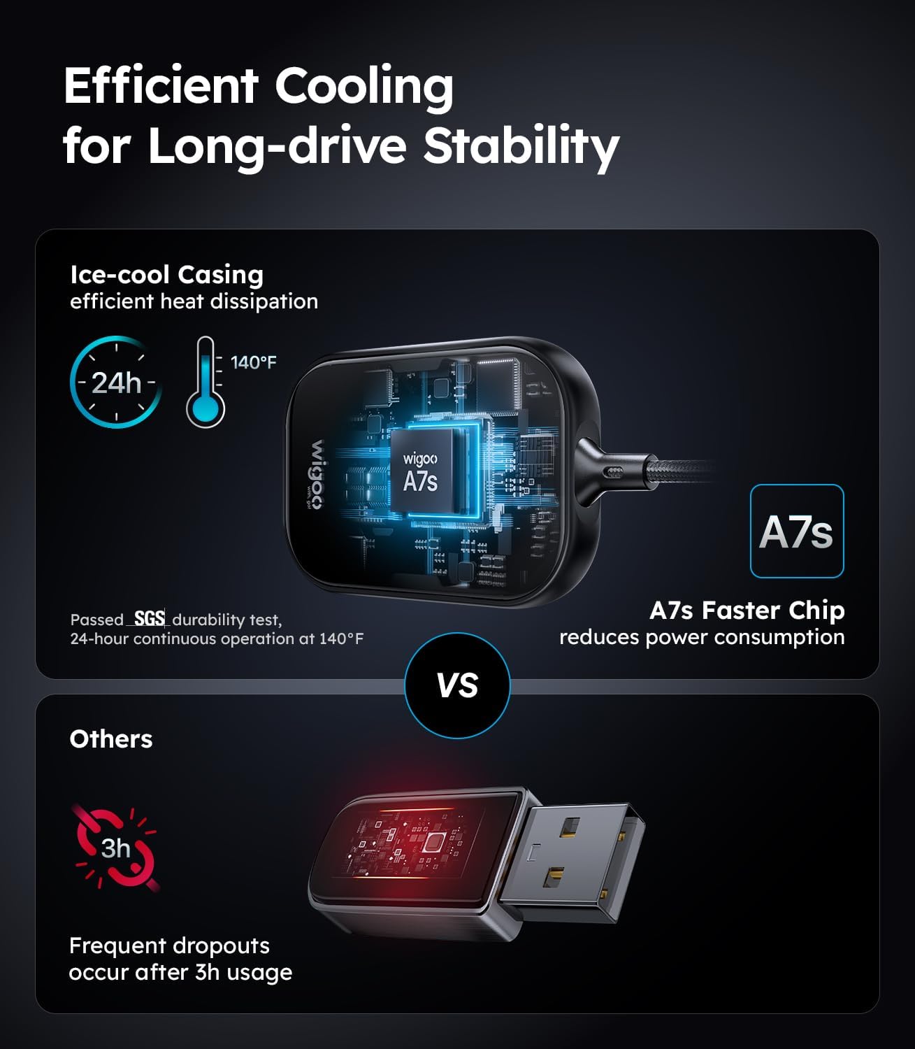 - [Reliable and Long-Lasting] Wigoo 2025 wireless CarPlay adapter features an A7S low-power chip and a cool aluminum alloy housing, offering 30% improved heat dissipation compared to other plastic-shell products, preventing overheating and disconnection. Its ultra-low 0.2W standby power consumption protects your vehicle's battery and extends the adapter's lifespan. SGS-certified, it can operate continuously for 24 hours at 140°F, making it an ideal choice for long summer drives or commutes.