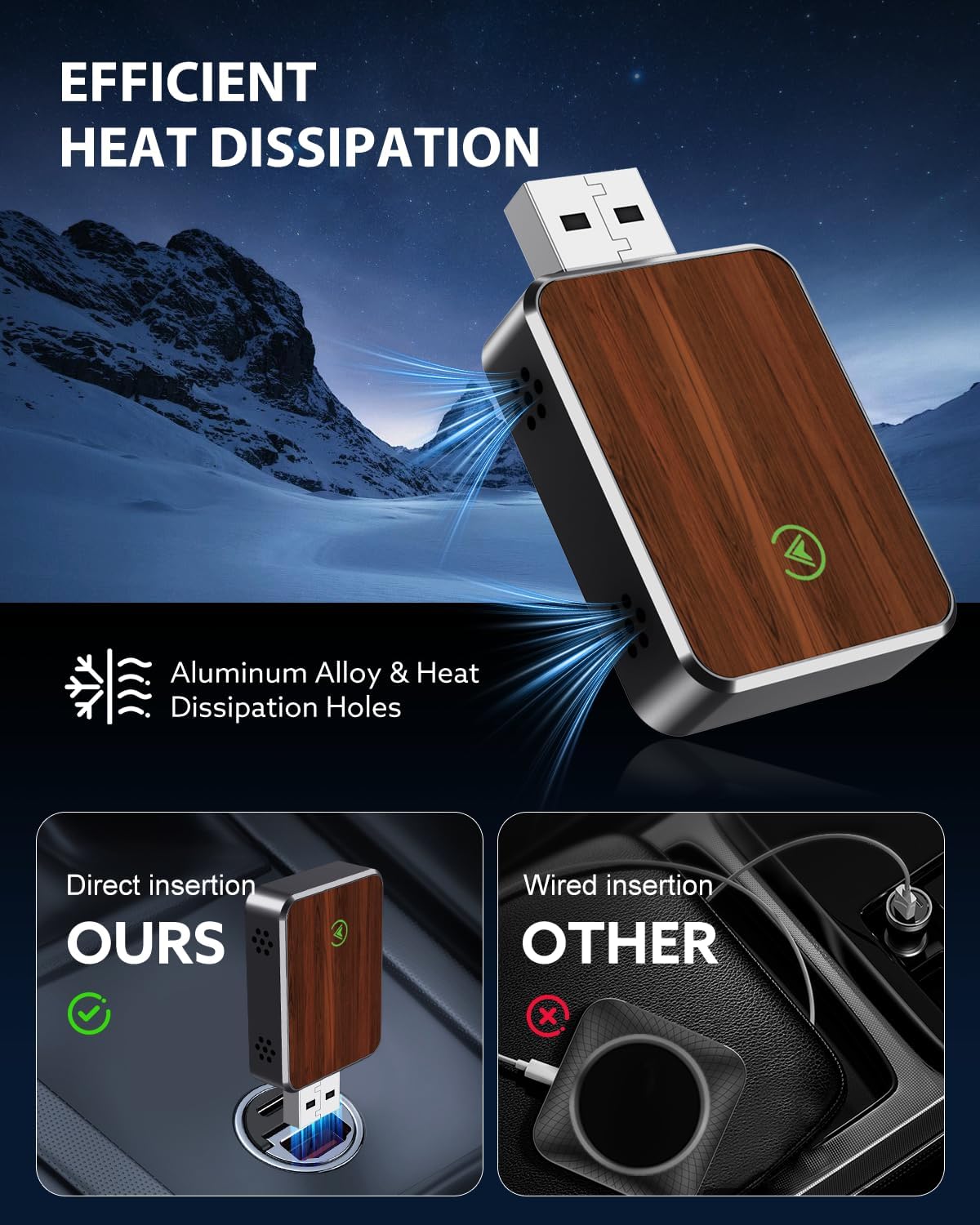 - Seamless Wireless Upgrade: Instantly convert your factory-wired CarPlay into a clean, wireless system with this premium adapter featuring a silver aluminum frame and smooth wood grain surface. It retains full functionalityânavigation, music, Siri, callsâvia your carâs original CarPlay interface. Enjoy cable-free convenience and a polished look that blends into modern interiors without requiring any app or permanent installation.