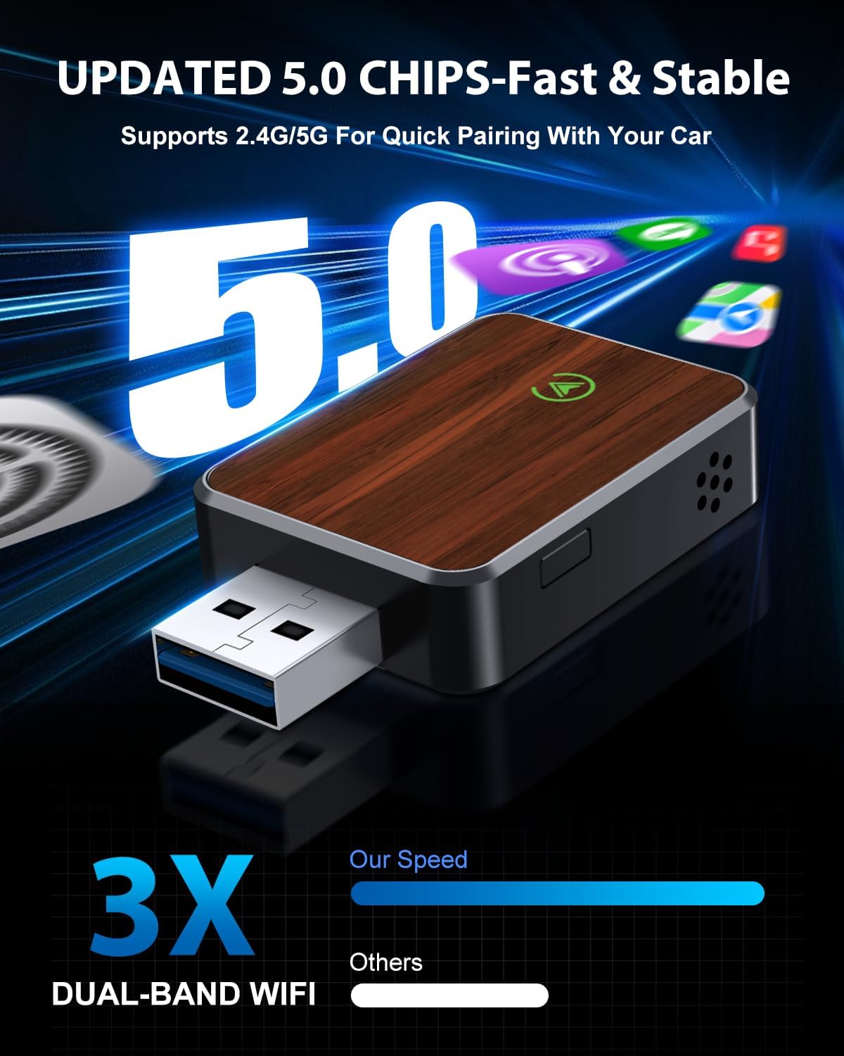- Faster 5GHz WiFi Connection: Engineered with advanced 5GHz WiFi, this adapter delivers faster data speeds, reduced signal interference, and ultra-low latency. Whether you're streaming music, navigating, or taking calls, the connection stays reliable and smooth. Say goodbye to repeated reconnections, audio delays, or lagâthis adapter ensures a wireless link that just works.