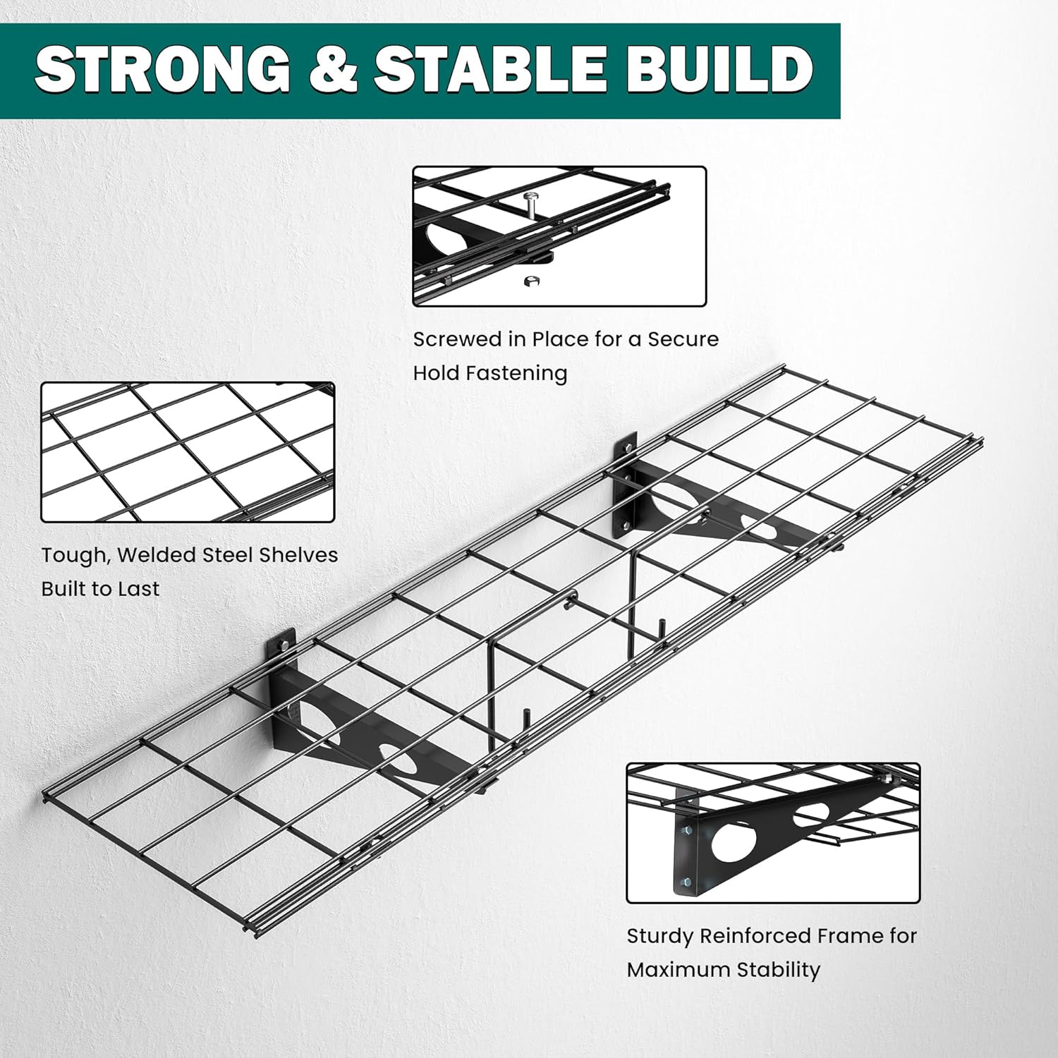 - RUST-PROOF COATED STEEL: Built to last, this wall-mounted shelf is made of high-quality powder-coated steel that resists rust, corrosion. Perfect for garage, basement, and laundry roomâeven in damp or harsh environment
