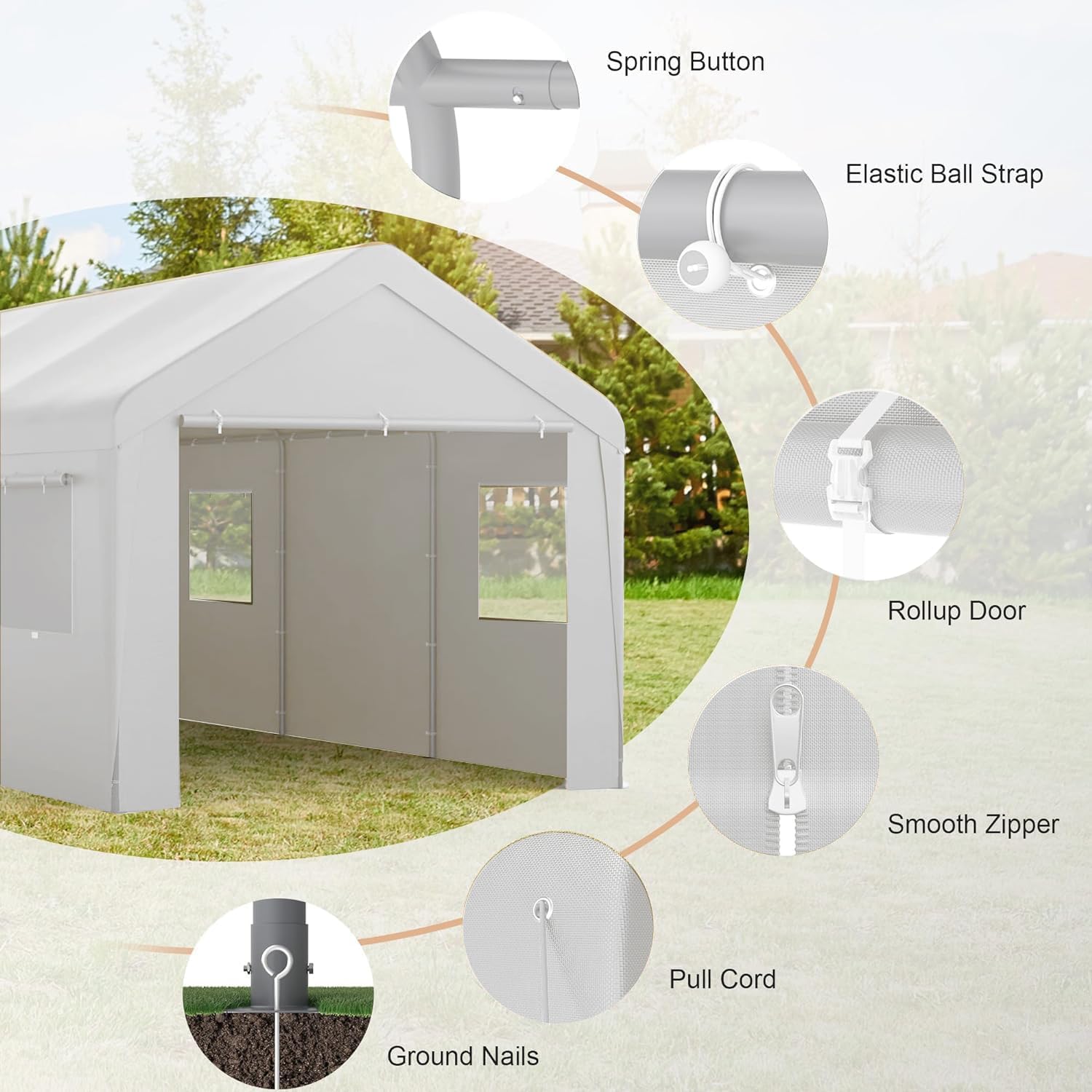 - Roll-up Zipper Door: Front and back doors with double zippers and buckles can be removable, make 10x20 heavy duty carport easy access for use and providing excellent ventilation