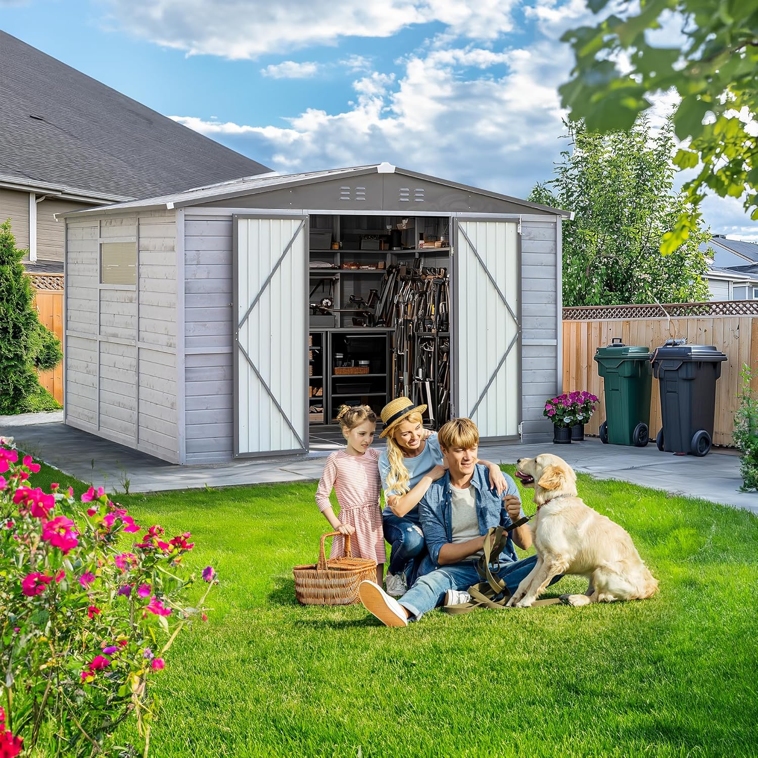 8x10 FT Outdoor Storage Shed with Windows, Wood & Metal Garden Shed, Outside Storage Shed Waterproof for Backyard, Garden, Patio, 4 Vents (Without Floor) Gray