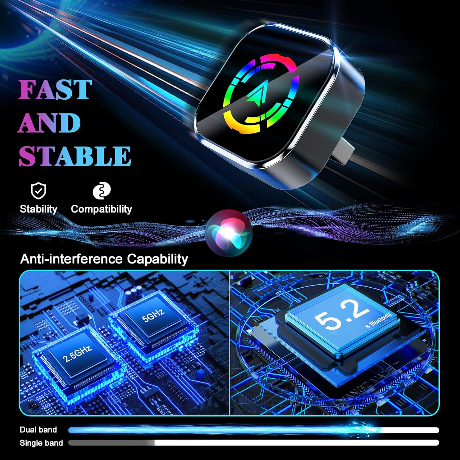 - 🚀 【Dual-Band Chipset, Smooth Performance】 2.4GHz + 5GHz dual-band ensures 100% faster transmission with near-zero latency for smooth navigation, music, and calls. Enjoy a pleasant trip with wireless Apple CarPlay adapter.