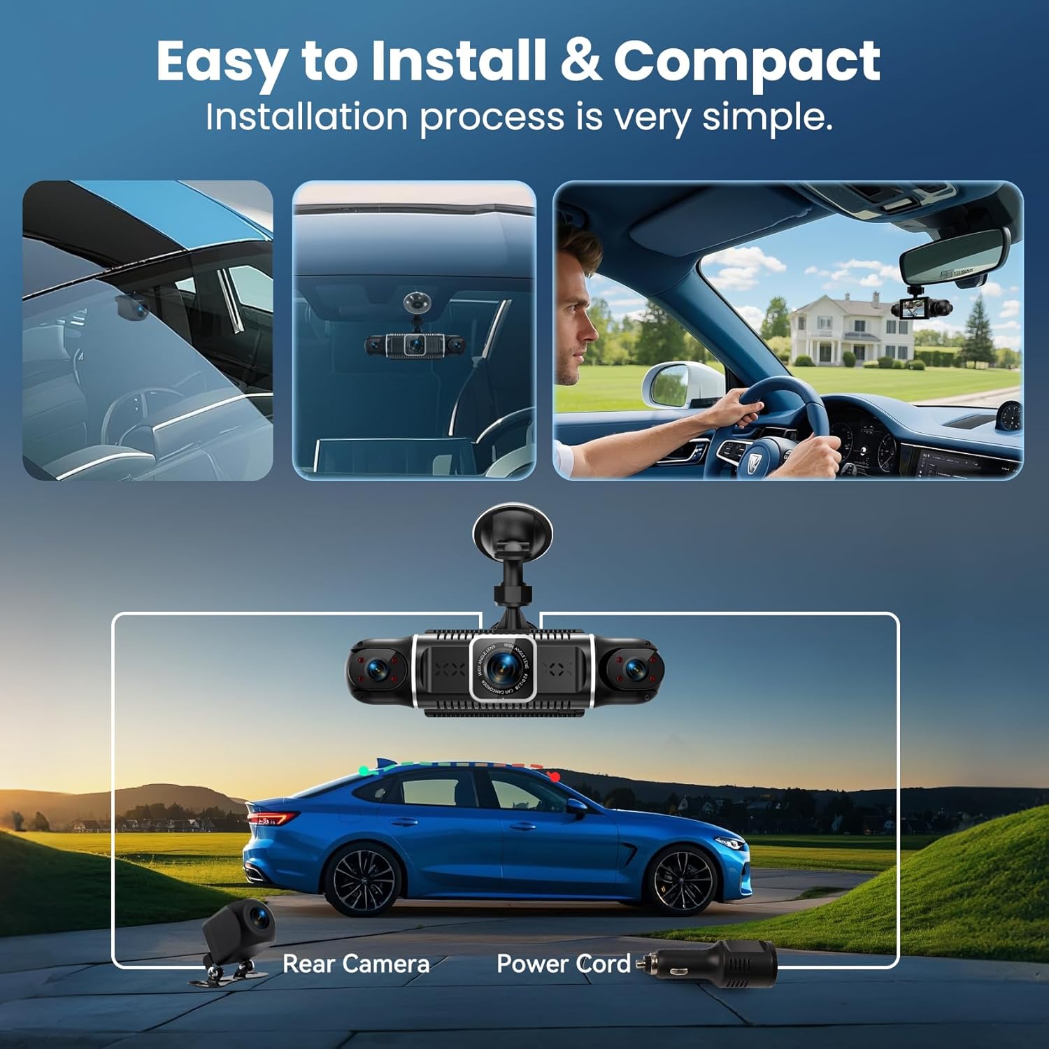 - Compact Size and Simplified Installation - The 360 degree view dash cam is compact in size, does not obstruct the driver's line of sight, and simplifies the wiring design. The accompanying wiring tools make it easy to install. Its compact design and simplified installation process make it a very practical choice in the market. Whether it's daily commuting or long-distance travel, this driving recorder, as an essential car accessories, can provide you with comprehensive protection and support.