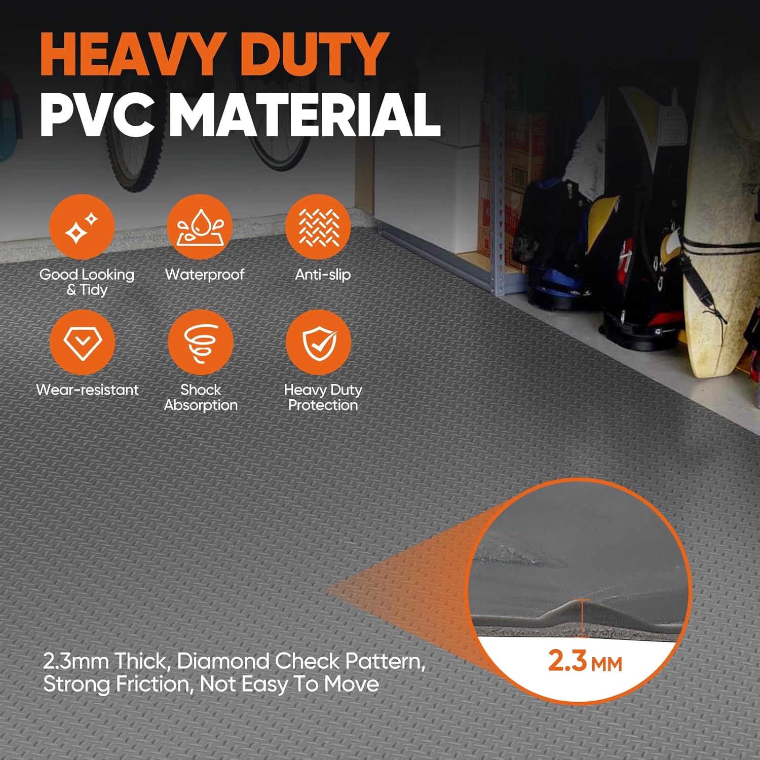 FAHKNS 7.5 X 17 FT Garage Floor Mat, Diamond Plate PVC Flooring Roll Thickened Garage Mats, Heavy Duty Parking Mat Waterproof Non-Slip Floor Protector For Car, Trailer, SUV, Basement, Gym, Shed (Grey)