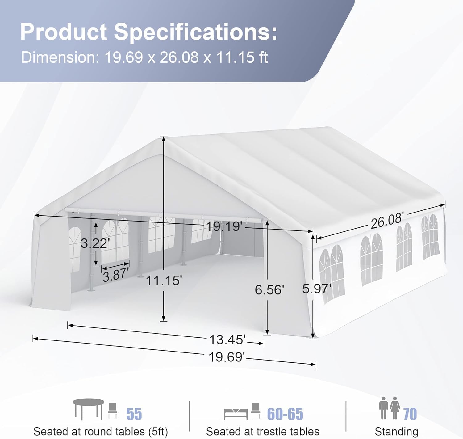- Removable Sidewall: 2pcs Walls each have church style windows, which attached by stretch rope and velcro, 20x26 canopy tent can be used without sides when not required