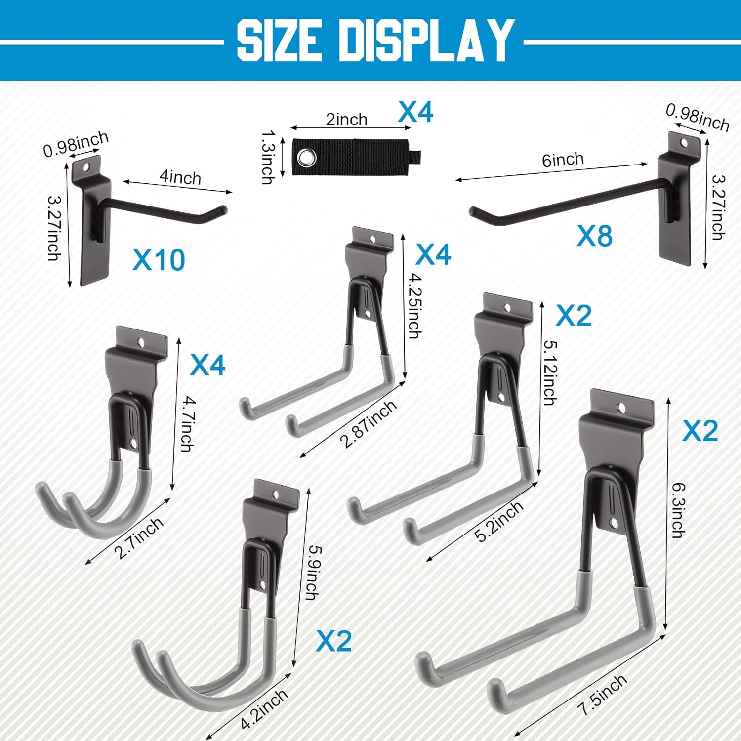 - Multi Size: these slat wall hanging hooks come in varying sizes, from small U hooks sizing about 2.87 x 4.52 inches, medium U hooks sizing about 5.2 x 5.12 inches, and large U hooks sizing about 7.5 x 6.3 inches; The package also includes small J hooks of about 2.7 x 4.7 inches, large J hooks of about 4.2 x 5.9 inches storage straps about 2 x 1.3 inches, and panel display hooks about 6 inches and 4 inches