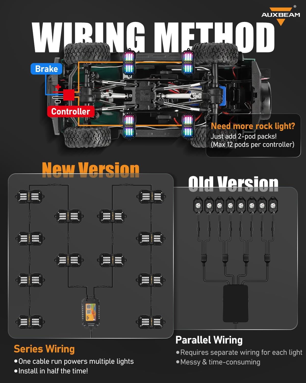 - DC12V COMPATIBLE & WARRANTY: Designed exclusively for 12V systems, ensuring easy plug-and-play installation on car, truck, ATV, UTV, marine, Boat, RV, and SUV. No complex wiring required. These 4-pod rock lights come with a 1-year Warranty by AUXBEAM