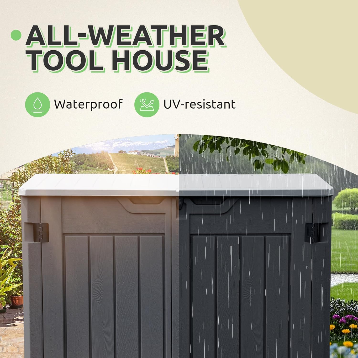 - All-Season Protection: Crafted from durable HDPE with UV protection and dual-wall construction, this storage shed is built to withstand sun, wind, rain, and snow. The woodgrain finish stays sharp, while the waterproof lid design keeps contents dry