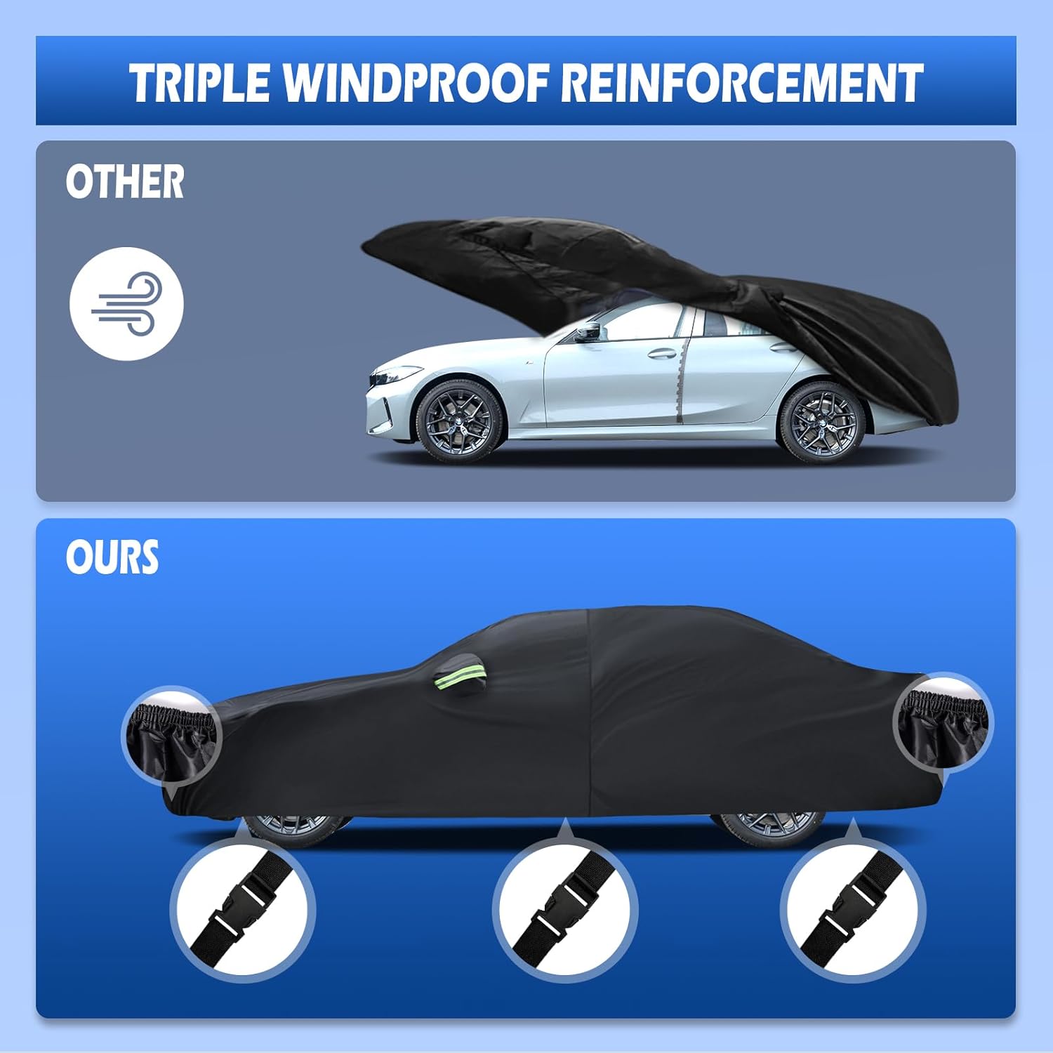 - Windproof design: All-weather waterproof car covers are specially designed to withstand strong winds. 1) Equipped with two bungee cords, it only takes a few seconds to attach to the tires on both sides, firmly covering the front and rear of the car. 2) There is a specially designed windproof belt at the bottom that runs through the middle of the car to ensure that the cover is not blown away. 3) Adjustable elasticated hem for easy sizing and securing the cover to the body.