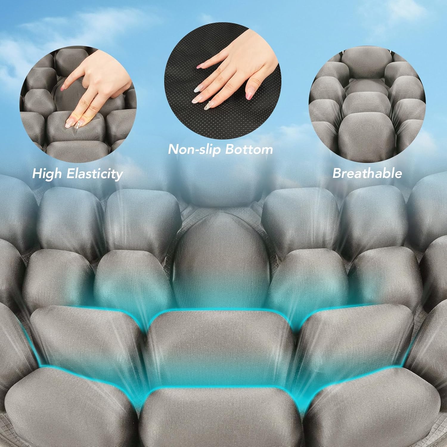 - Bionic Honeycomb Pressure Relief: This 3D inflatable seat cushion equipped with 34 ergonomic airbags dynamically conform to your body, targeting the ischial bones and coccyx to disperse pressure by up to 73%. Patented spinal alignment technology transforms hard seats (even economy-class) into sofa-like comfortâideal for office workers, travelers, and lumbar recovery
