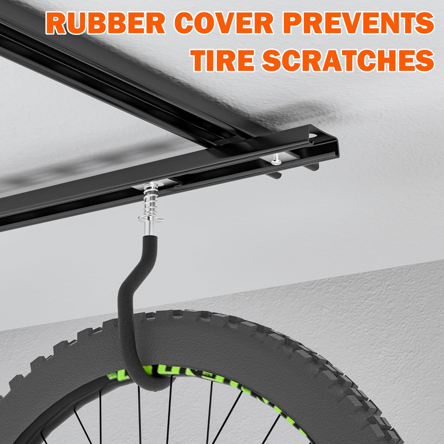 - Heavy-Duty Hooks: Includes six heavy-duty hooks with thick rubber coating for better grip and wheel protection. Each hook supports up to 66 lbs, ensuring secure, long-term bike storage