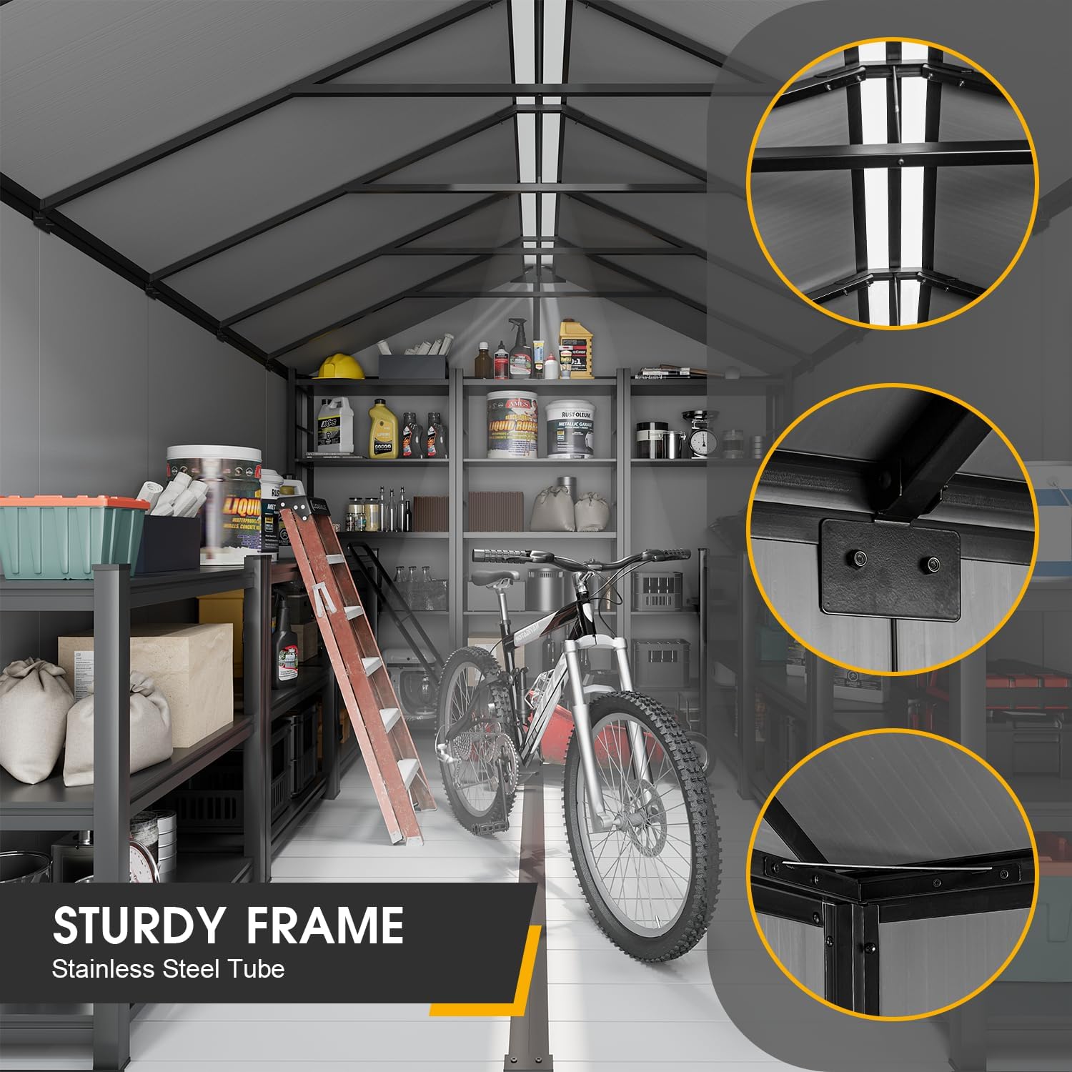 - Spacious Storage for Every Purpose: This resin storage shed offers spacious storage for 10 bicycles, various gardening tools, pool supply, patio furniture, and more. Gardeners, pet owners, and outdoor enthusiasts will find it appealing as it provides a safe, waterproof space to meet their needs